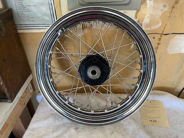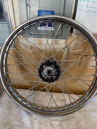 Wheels and hubs finally done. Both rims (21 & 16) are aftermarket. Star hub is OEM that I had powder coated and rebuilt. Dual flange hub is new from W& W Cycles (only place I could find one that wasn't chrome or beat to $hit). Spokes are Buchanan stainless.