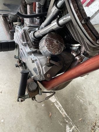So this was delivered to me yesterday. It origionally belonged to my brother-in-law; it now belongs to my niece. Hasn't been run in at least 15 years. The last time I had it in my garage was somewhere in the late 90s/early 2000s when I removed the e-start that Michael had initially asked me to install (figured he thought he was just too cool for anything other than a kick start). He, my sister and their daughter relocated from California, to Arizona and to Florida. Somewhere along the line he checked out on life, on my sister, their daughter and his grandson. He rode the bike exactly twice in Florida and parked it. He is now in a full on care home (***** him).