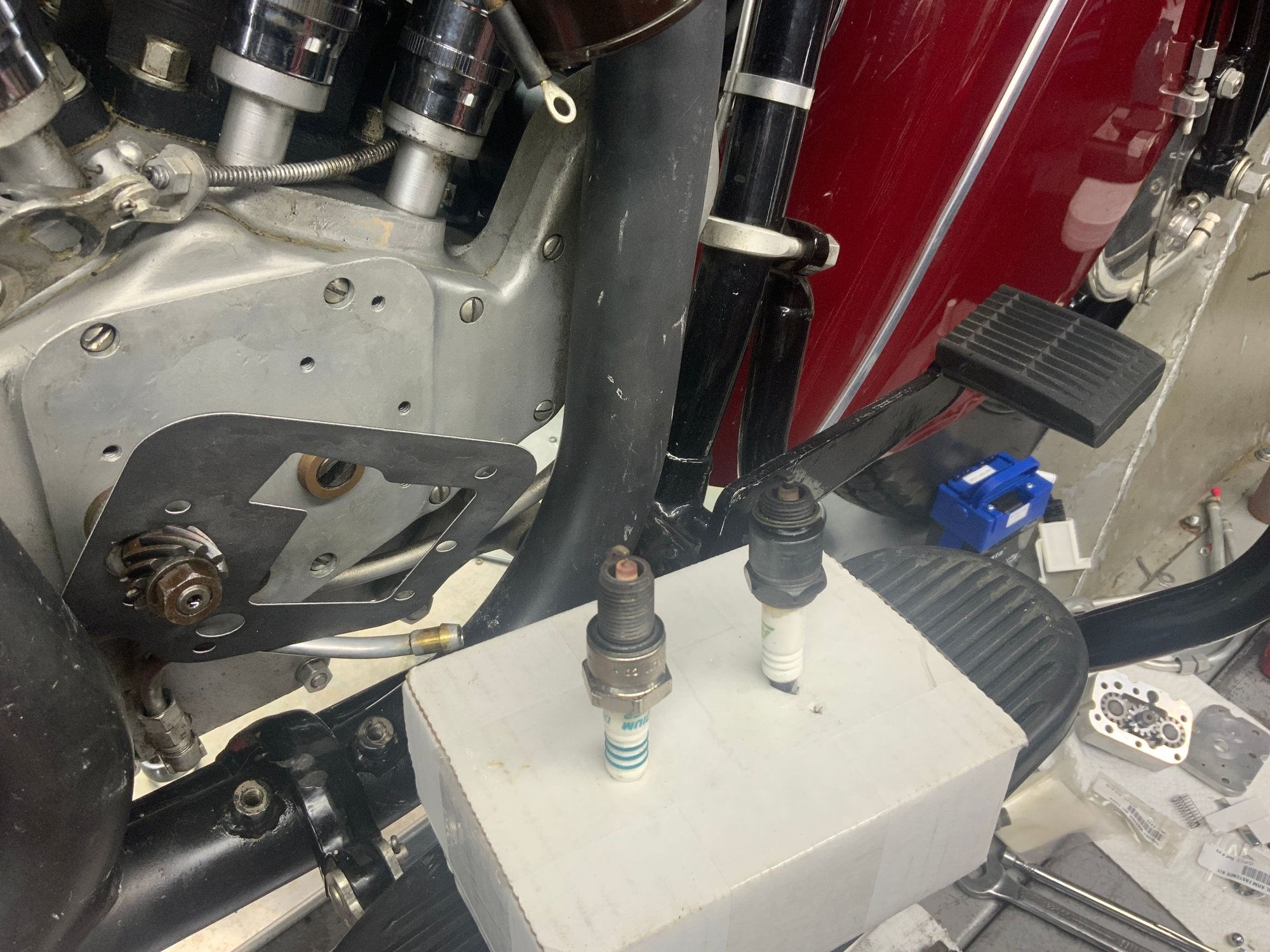 NOW - this is if the points are set correctly both sets in the distributor two timing marks are on the flywheels for this ( read the factory book about this more then twice till you really understand ) and make sure using a test light the points are braking at the correct moment -BUT report how much play is in the distributor back and forth this is make you nuts tuning it and yes e 2000 ed makes a electronic trigger to eliminate the 2 sets of points 6 volt you need a 1.5 OHM coil and 12 volt a 4 or 5 ohm coil he recommends a 3 ohm but not an electronic i have never found one and looked we have for indians but not Harley we use a 5 ohm point coil 12 volts