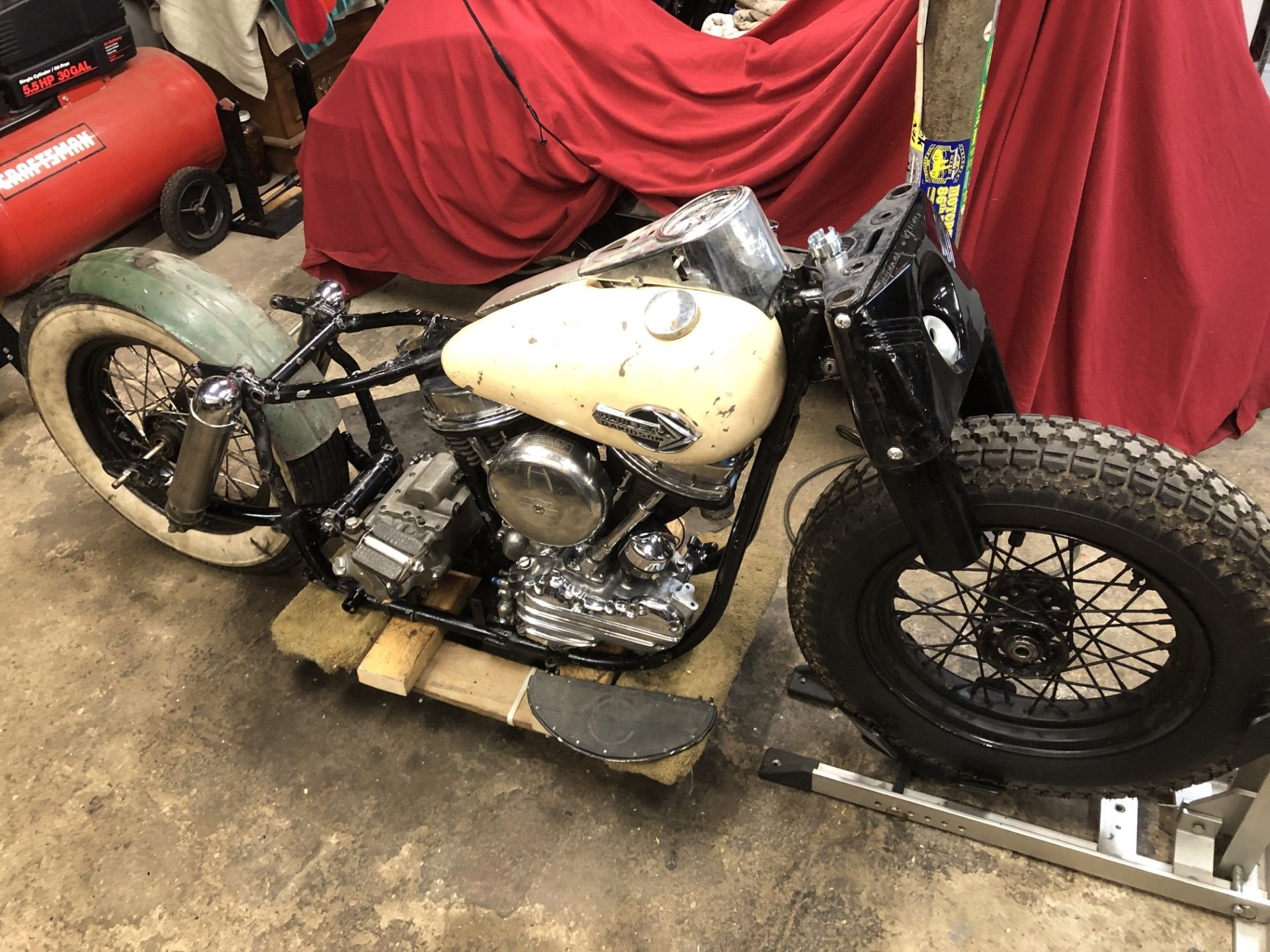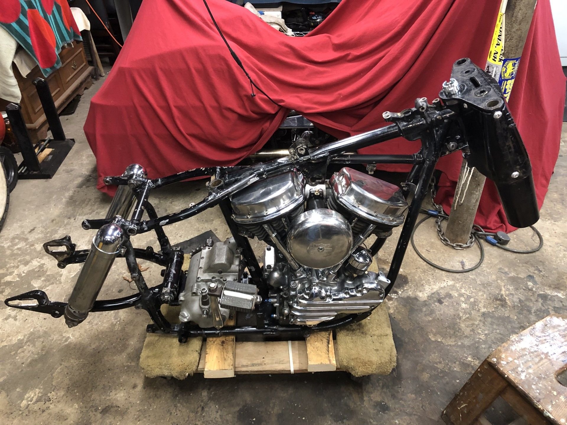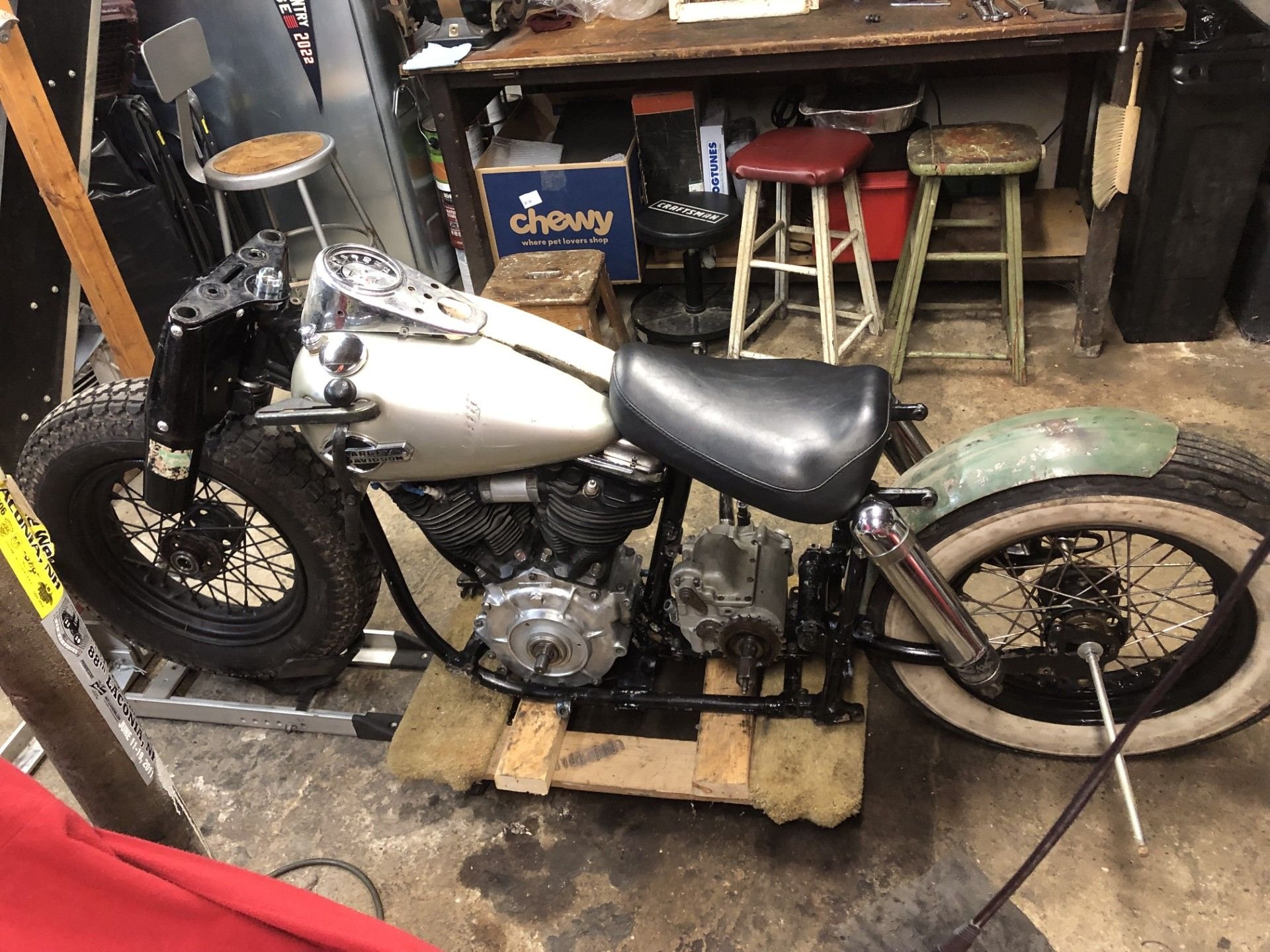 We had house guests for the weekend from NH, so I took advantage of another set of hands and put the motor in the frame just to check things out. That of course turned into some imagining with parts on hand. Black jugs/heads less of an eye source in the bike, glad I stripped the cases though. Still need to get this to be a roller, ran out of room in the basement shop at least one bike ago.