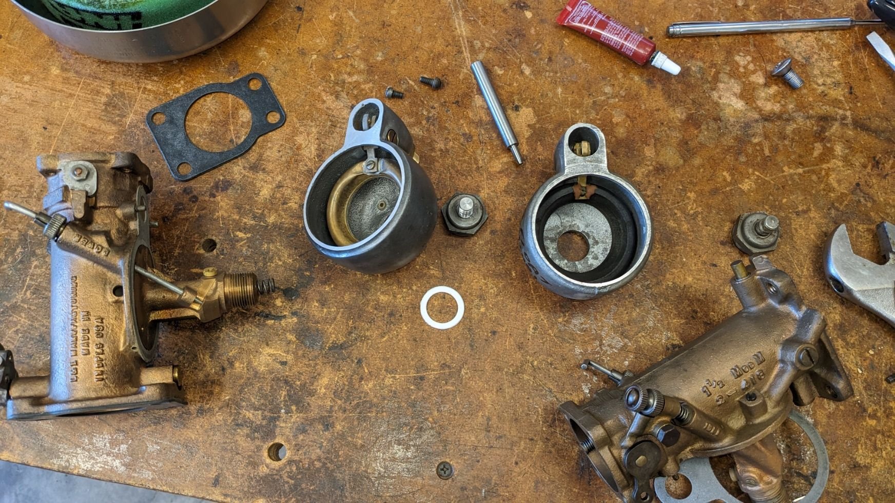 Next I pulled the carb. What a PITA. The loosening the throttle control wire was almost impossible with the 5 gallon tanks. I could not get a straight enough shot shot the slotted screw so ended up using a pair of small vice grips.. Get the carb loose and I can't move the car high enough to pop it out of the lower bracket. The throttle arm hits the bottom of the tank.. I finally manage to pry pop the carb bowl nut stud out of the lower bracket and get the carb off.