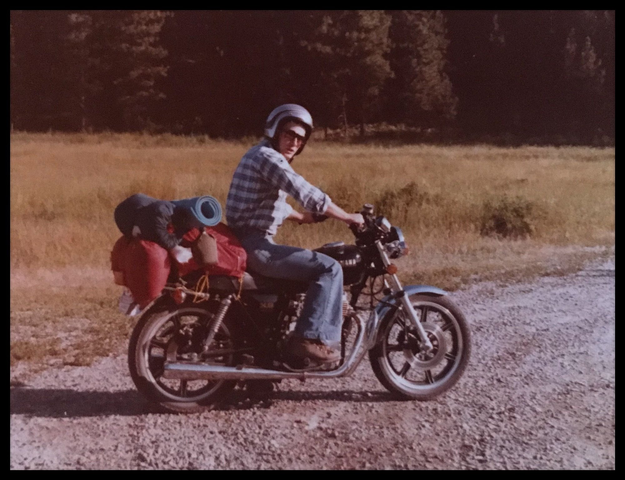 Hah! Bell bottoms! Bicycle chains would tear those pants to pieces ! Mom would say "I'm not buying you any more pants!" Of course I would threaten to go out in my undies then and pants would appear in my room. . Once the bottoms were torn up though, I had plenty of shorts for Summer. . I had a Honda similar to that bike but never ventured out more than a few hours. Looking back I wish I did.