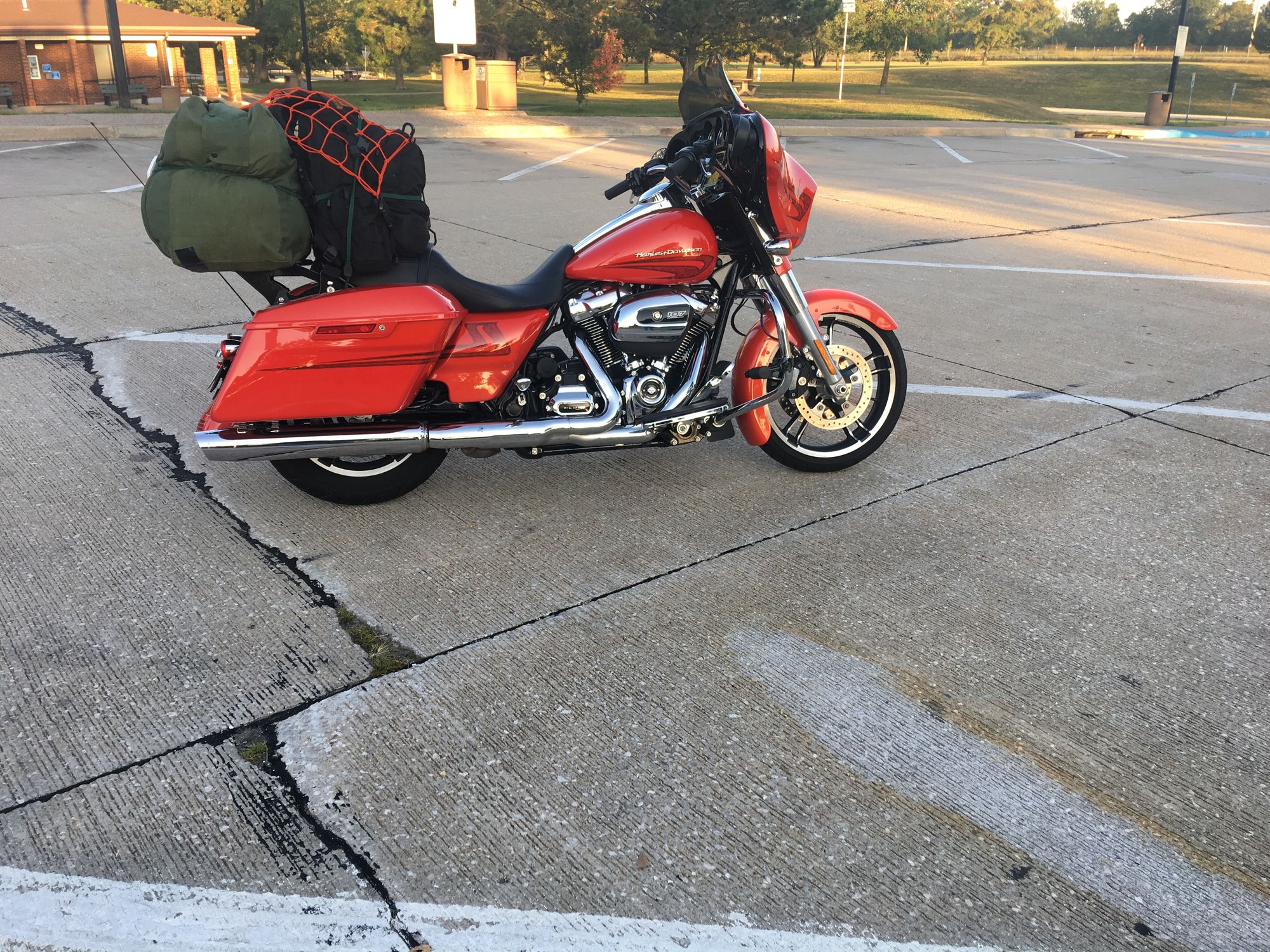 Now most any trip over 500 miles is on the Street Glide. This was a set up for a trip where I was camping. Heaviest items and stuff like my tech went in the saddle bags so it would stay dry. The green flight bag had my tent, a camping chair, an air matress, sleeping bag and few other odds and ends for camping. The backback had mostly cloths and food and probably some more camping stuff. I've done three 5000ish trips on the SGS and a couple 2000 ish trips on it. Though on the 2000ish trips I wasn't camping so just a roll bag with clothes was all the extra luggage.