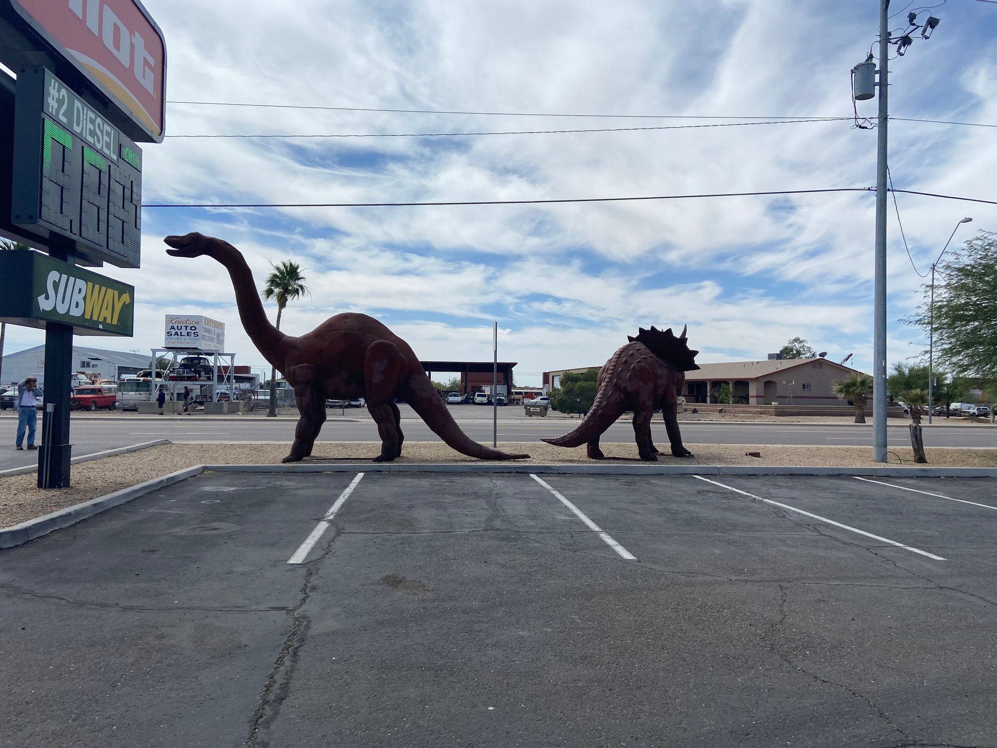 Further West of Yuma, the mountains were getting closer, and temps were in the high 80’s. As we started up the mountain, it felt like we had dropped 10-15 degrees in the span of a few miles. It hit a low of 59, which isn’t bad until you factor a 70 mph wind and very light clothing. We were freezing. I was shaking and we finally had to admit to stopping and adding a layer. The casino at that exit was advertising $7.77 Prime Rib. Tempting.
