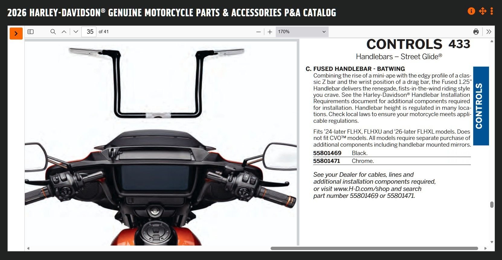 Handlebars, upper clutch cable, mirror fairing plugs, etc. The problem I'm having is that I find in HD's parts and accessories catalog a set of bars I like and sure they're going to fit me quite nicely. Part number 55801469 "Fused Handlebar - Batwing". It fits all of the '24 and later Street Glides, but excludes the CVO models...