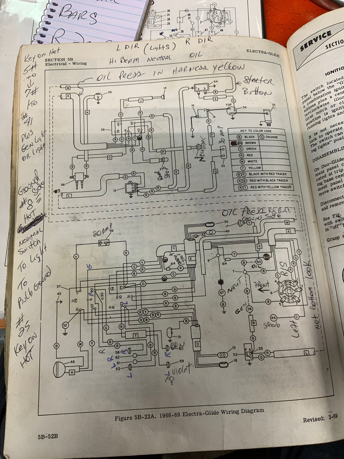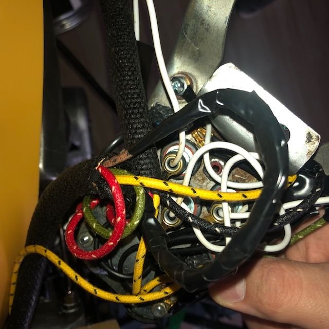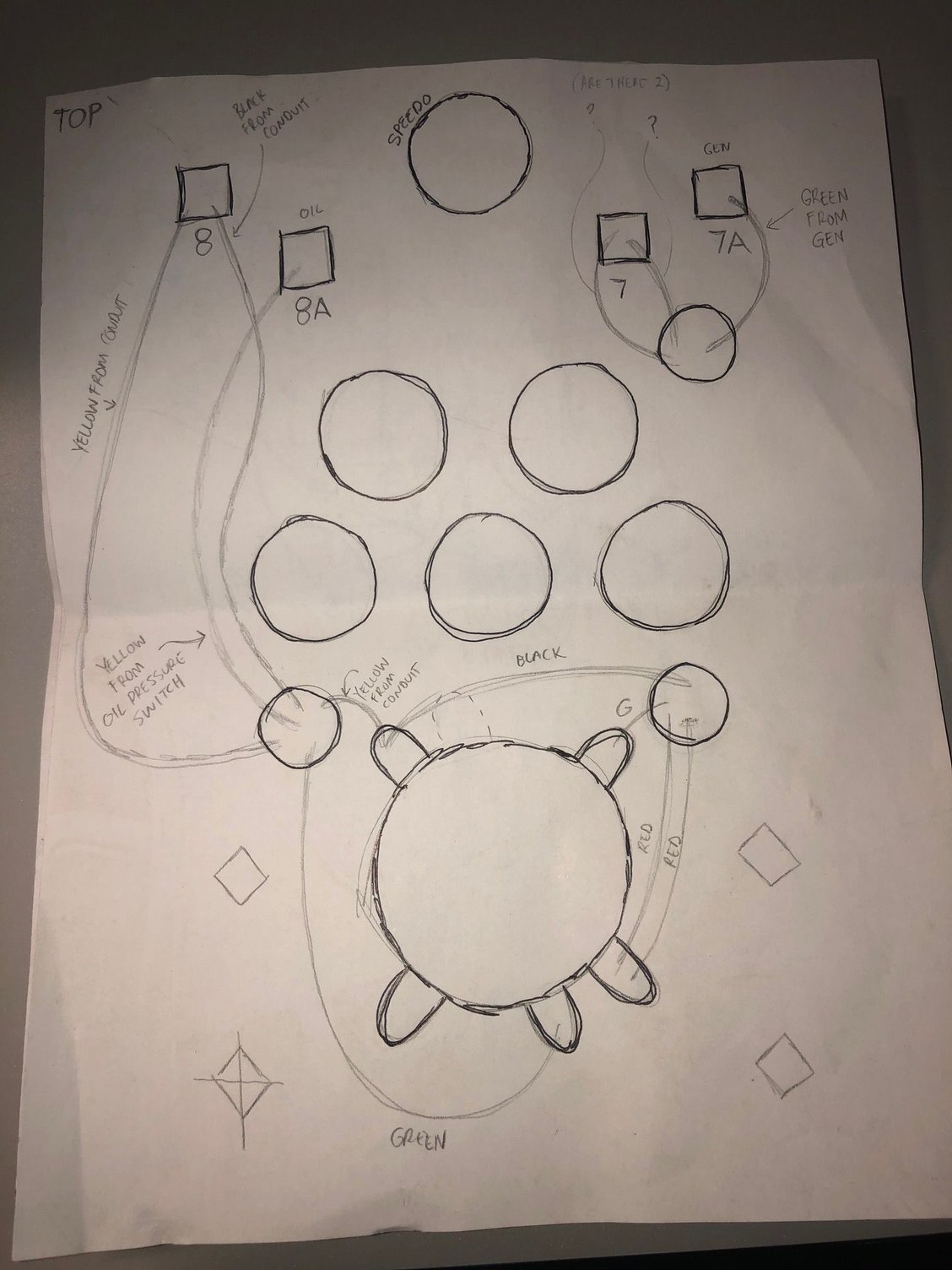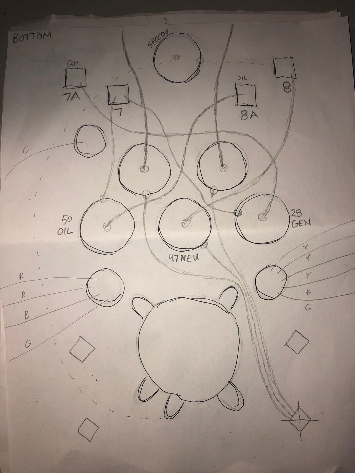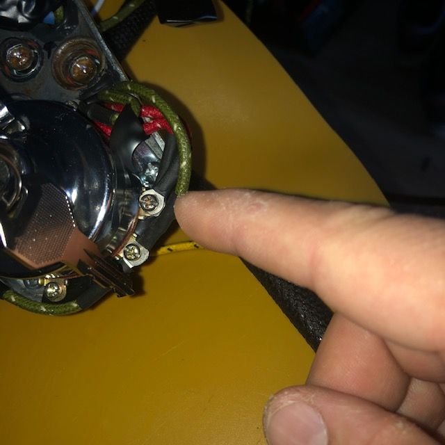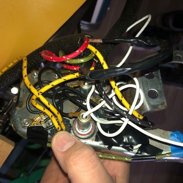 top view of schematic. J8 gets B&Y from C // J8A gets Y from oil // junction 7 gets B grounds (outside wires) from oil/gen lights // J7A gets G from Gen (A) ///// ignition supply (1) gets Rs from C & A // ignition (2) gets Gs from speedo & C // ignition 3 empty // ignition 4 gets G from A // Ignition 5 gets Y from C and B from J7 (i cut a wire to go there) Bottom scheme of dash panel. Lights are labeled with whites (hots) from middle and grounds (blacks) from sides (external, or socket body). I laid it out like I saw a in a replica dash panel. I'll add the link to that replica panel in the message body. Solenoid, (top) red to +ve, bottom to starter motor, green to starter relay tab 2 (1st bottom tab) Regulator, battery tab has connections to terminal box #39 (with feed to supply switch 1) // to starter relay tab 1 (side tab) // to 30 amp breaker (with feed to +ve) 30 amp breaker -- battery side to +ve, arm side to regulator's battery tab Coil top gets black from Terminal Box 41 and bottom gets black from "Circuit Breaker" (distributor). Neutral switch -- two blacks from terminal box 41 & 42 Terminal panel -- conduit C connections are Y to 25, G to 9, R to 10, B to 24. Another B from 31 to starter relay tab 3 (2nd bottom tab) Physical view of top side of dash plate, following the schematic also posted. Physical view 1 of the bottom side of dash plate, following the schematic also posted. Physical view 2 of the bottom side of dash plate, following the schematic also posted. Switch Supply (Ignition terminal 1) sparks when i touch the wires to the actual ignition body on accident. One of the red wire terminals got RED HOT on one of my attempts at turning the switch on. Something not good going on there. Oil pressure switch , one yellow to J8A in dash plate. Physical view of top side of dash plate. Forgive all the electricap tap, but since the plate was sparking to the top moount I was working through a process of elimination to make sure everything was insulated properly and the plate wasn't hot. Top dash plate mount, which is where I'm occasionally catching sparks from when the switch is turned to any position other than off.