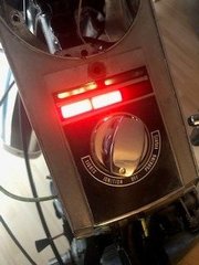 Last night, wanted to test the wiring, so connected the battery for the first time. Dash base assembly bolted to frame. Turned the ignition switch on. Circuit breaker popped. Lots of fiddling, lots of circuit breaker popping. More fiddling. Neutral light popped on for a second. Small success, I think, followed by more failures. Attempt after attempt -- see sparks at top mount of dash base. Gotta be a something hot touching the mount plate, I figure. Disassemble terminal posts, reinsulate with hi-temp electrical tape and try again. Still sparking on top mount. Use voltmeter, getting what I think are mostly accurate readings. Switch terminal at headlamp reading funny? Remove both red supplies from switch terminal. Caught sparks when one hit the ignition switch housing. More fiddling, more trying. Both red supplies back on, try again. One of the supply terminals glows RED HOT when ignition switch is turned on. Figure that's a critical issue. More fiddling. Double check all connections in terminal box are accurate. Yes. Double check all current connections to panel are accurate (note that as explained above, many "accessory" items are not wired in yet). Yes. Now it's 11pm, so I try one last time. Circuit breaker pops. Decide to shut it down. Disconnect the battery, live to fight another day.