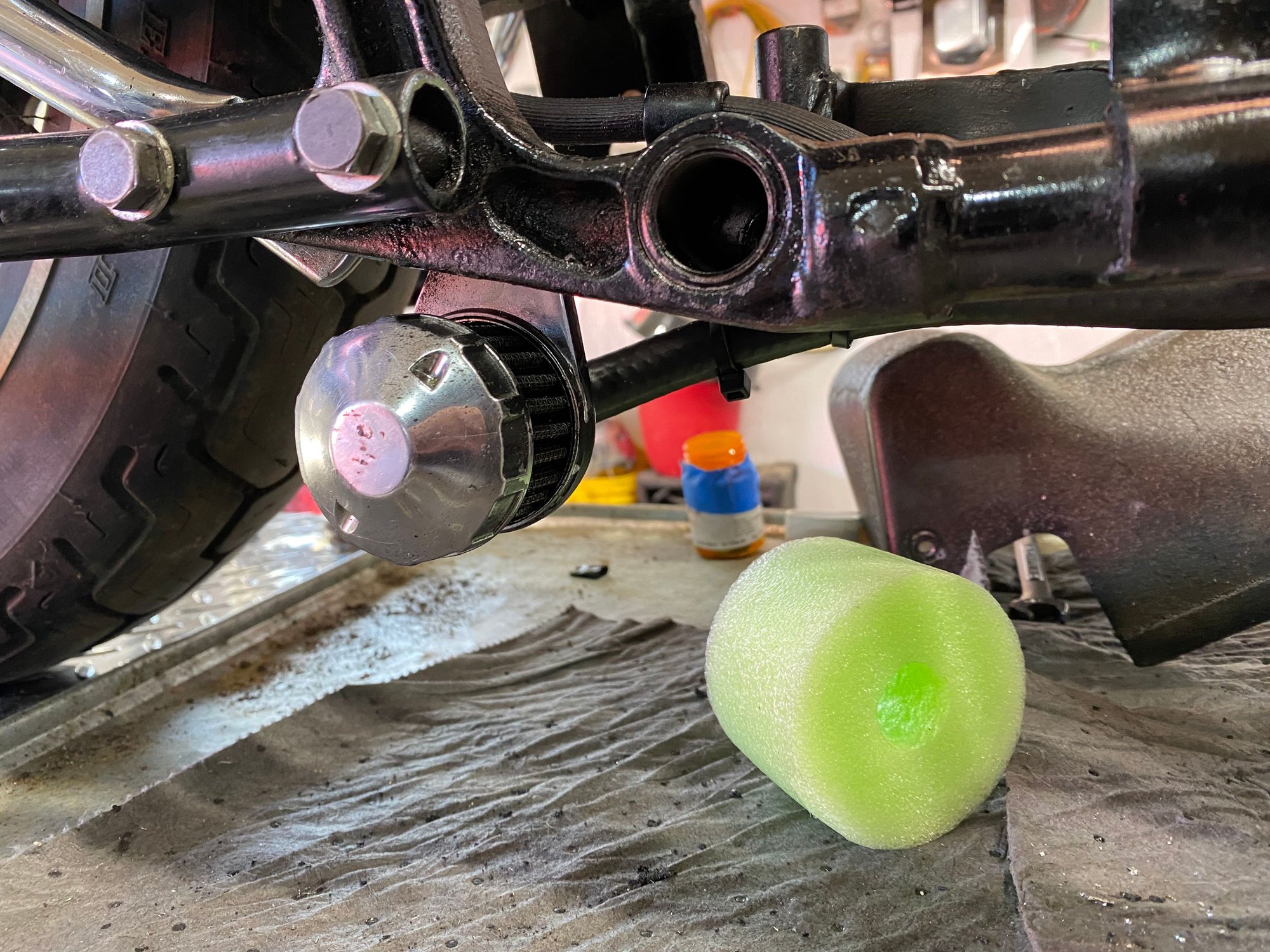 The same on my 77 super glide, I went a little further, installed a catch can, just can not remember from were I obtained it. But it has a filter screwed on the top just another conversation piece when looked at, " what the hell is that for?"