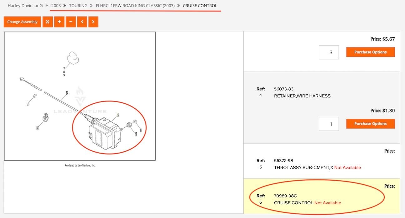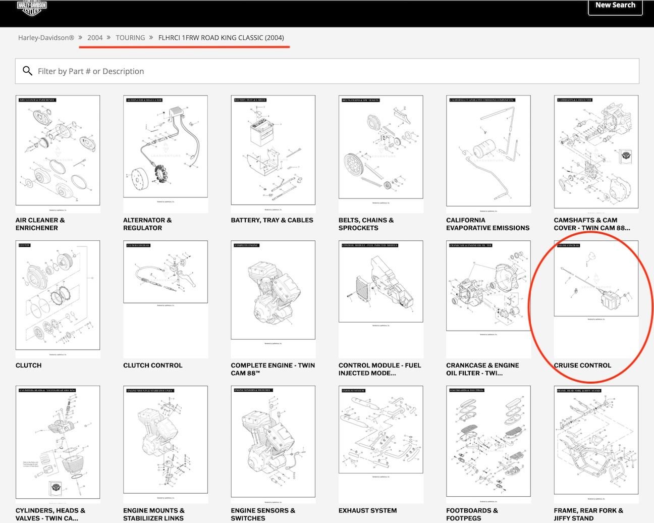 For the sake of comparison, here are the 2004 Road King Classic parts diagrams, which came OEM with an optional HD mechanical Cruise Control. The "Cruise Control" module is listed in proper alphabetic order. This is what the Heritage parts list would look like, if it came from the factory with an OEM cruise control unit.