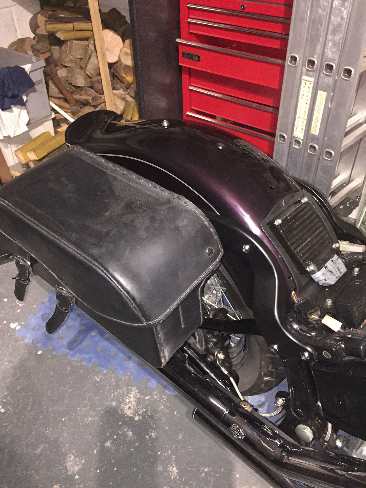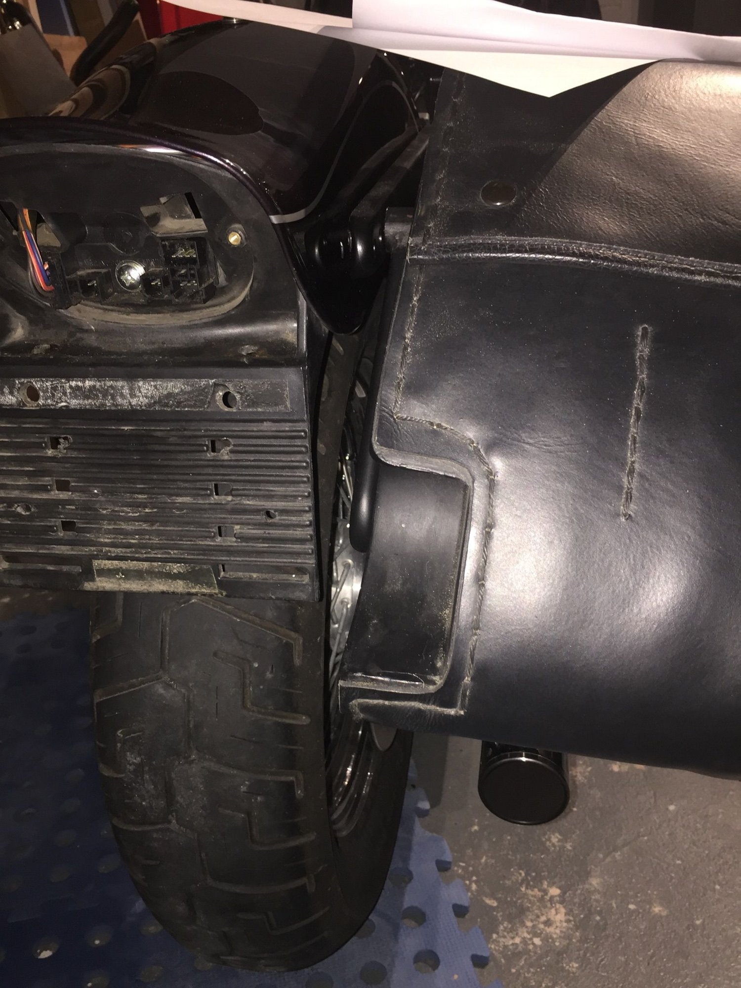 Bags need a bit of a clean but otherwise seem ok. There is a cutout in the back edges that's clearance for the indicators on (I assume) a bike with low set indicators. I then did a little "Googling" (is that a verb?) to see what others have done and found a bracket bent around behind the number plate bracket. Looks easy enough & I'll have a go at making something like that? Anyone know how think a piece of SS bar I would need? 2mm?