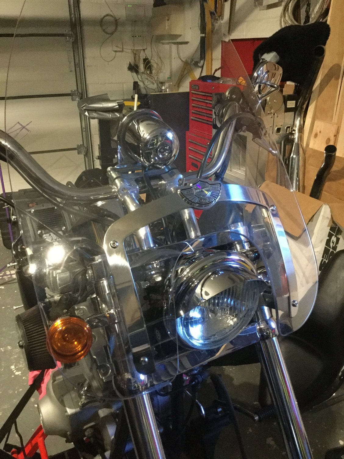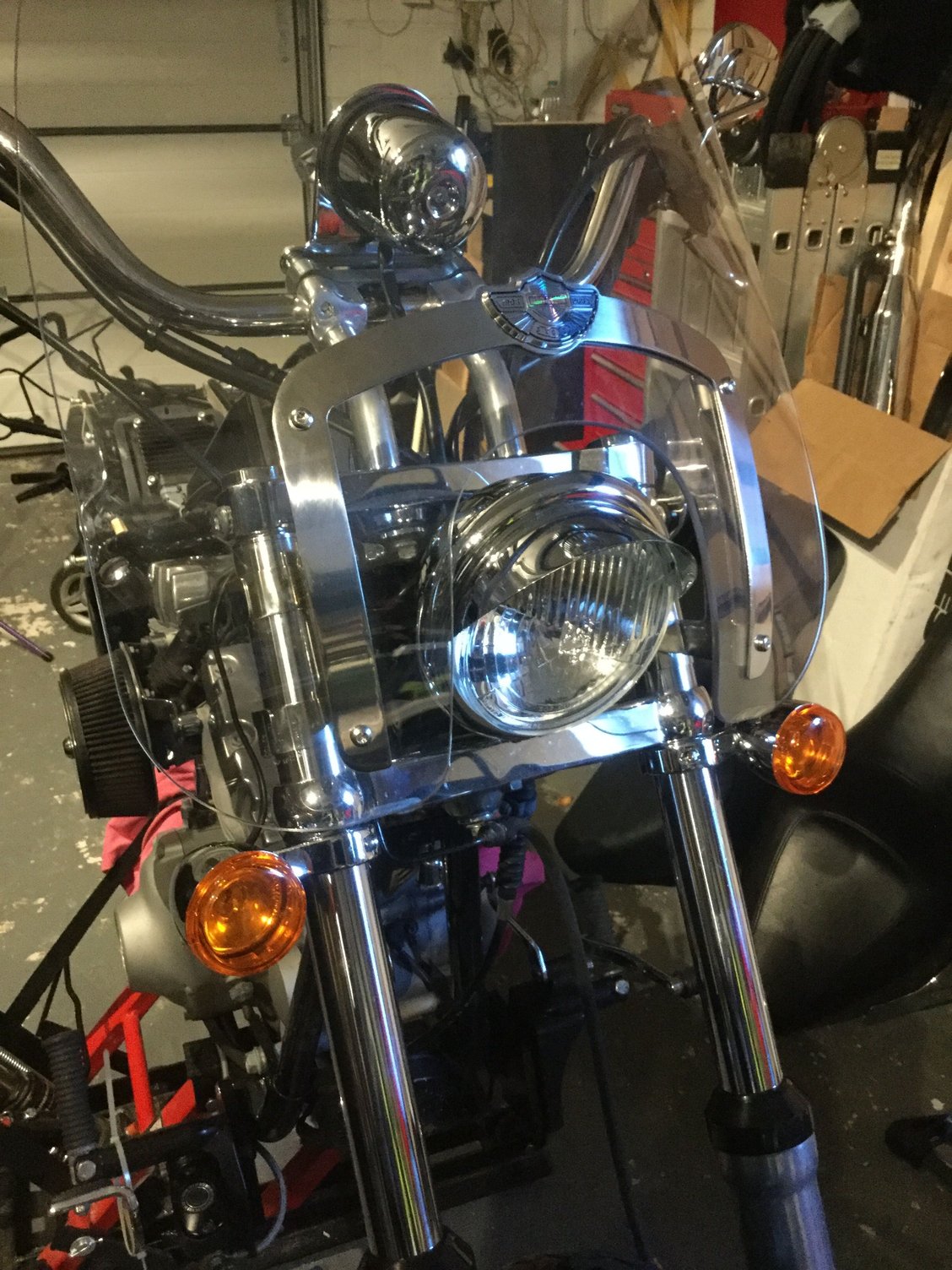 Easy bit to start with... the first test fit of a screen. Got hold of a 2003 Deuce screen from Facebook and fits a treat. Took a little fiddling with the fittings but more due to my inexperience and nothing having a set location.