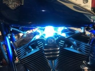 Im also placing Blue LEDS , Where no one can see them or the wiring, this is tricky, I have two bars in these pics, took off tank, stuck them both up high ,both sides, and I'm placing two more lower tonight, I used a battery tender 7.5 fuse and the lead for the positive, and I have a neat hidden chrome switch, pretty trick, as I asked several people to find the LEDS "Harley owners!" haha