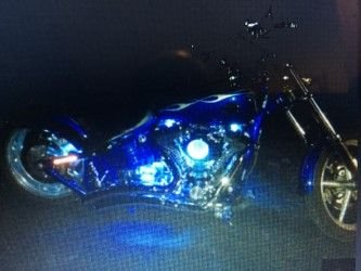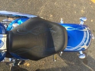 here she is, the blue one, I just happen to have a good friend with a black one, here, she's basic, Vance and Hines Big Radius Pipes, Screaming Eagle Intake, FP3 Tuner, All Kuryakyn ISO Line, Grips, Spear Bar ends, Foot Pegs, Brake Pad, Extended Shifter 1", Also passenger ISO pegs, in garage as wife said shell never go on bike ,OK? in these pics I also did the Sprocket/Gear MOD ,72 Sprocket,30 main gear I believe? Mod a sticker on here as we'll.Danney Grey Seat W/Blue Flame Stitching.I did most of this first month I had, than came winter.