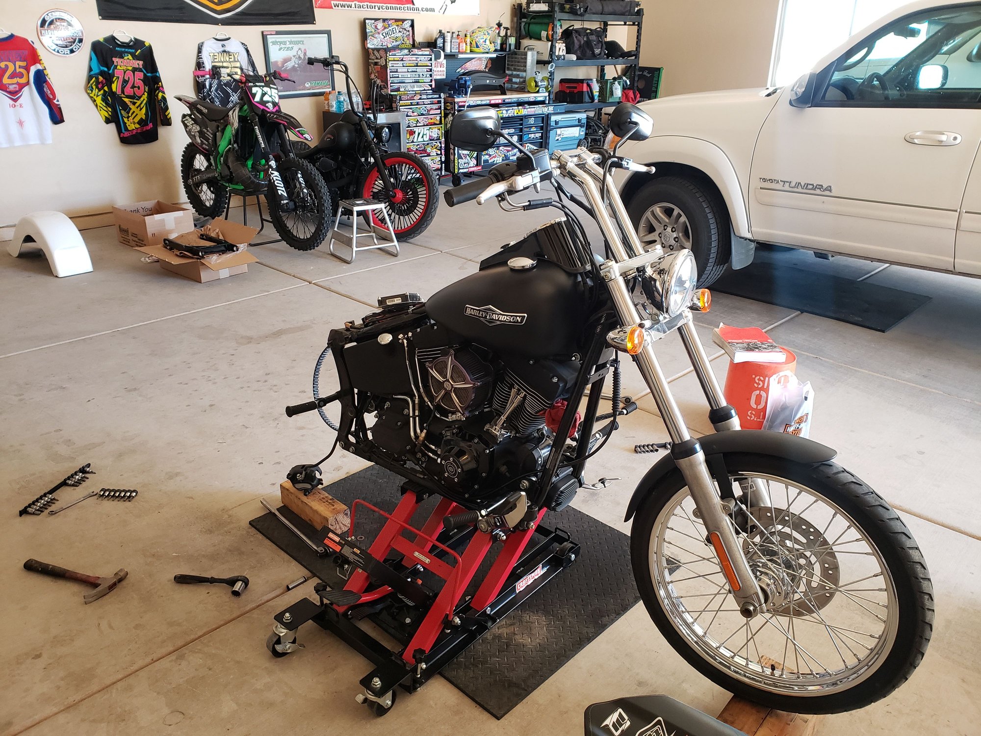 Well, I found and bought another 09 Train and decided to do another build. I was going to keep it simple then I got carried away. My plans are to do a swing arm FL style rear end on air ride. Freight Train front end with 16" or 18" apes and I think I'm just about sold of the idea of putting a 26" wheel up front. It's going to take some time but I got cracking on it the other day. Once I get the rear end on I'm going to start building a complete custom Titanium fishtail exhaust. It's going to be a long process but it should come out killer!