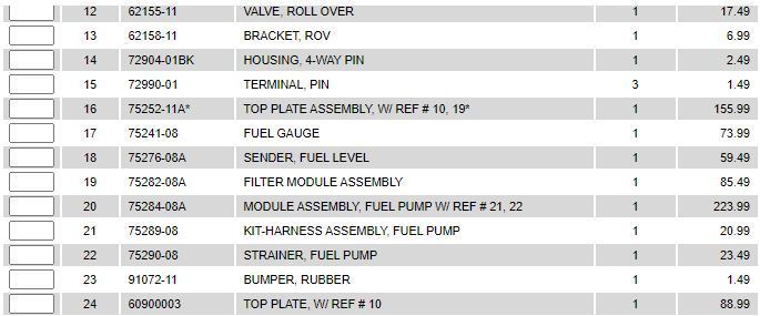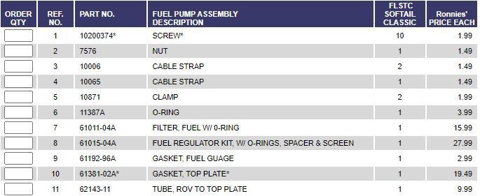 Bike is a 2012 FLSTC. I am changing out the fuel regulator housing in the tank and i am having a hard time trying to purchase the 2 fuel lines in the tank. The 2 lines are the check valve and the fuel line together and the other is fuel line that goes from the pump to the regulator. I have searched on line and the dealer is no help. Any help is greatly appreciated