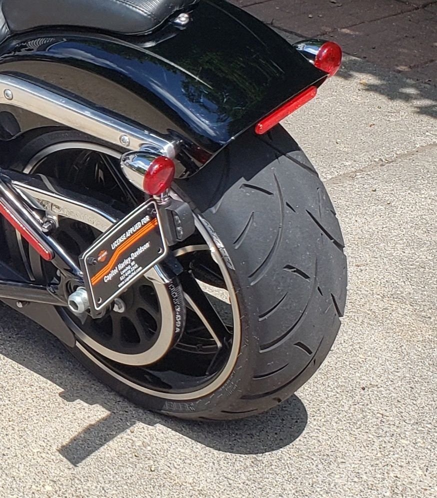 Here is the international plate mount with a few mods. I installed a lighted license plate frame and used an old reflector for now to cover the holes where the factory plate light goes. Also in this picture you can see the new LED taillights and the new swingarm bag.