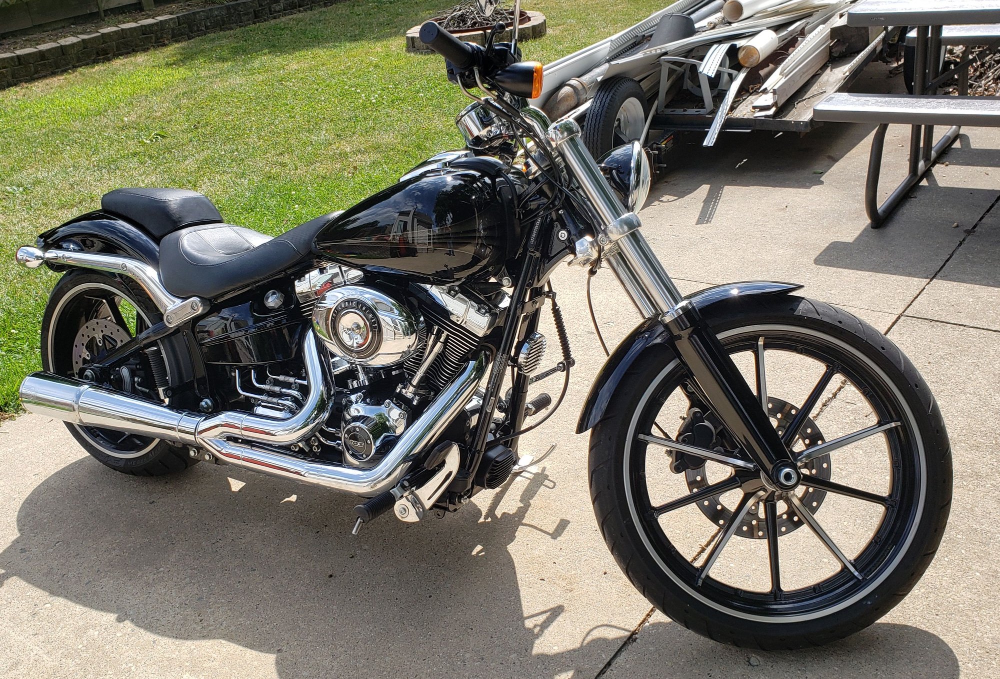 Well I mentioned in my Forward Control thread in the 2018 Softail Section that I broke down and got another bike, I found a good deal on a 2013 Breakout with 4020 miles on it. I have already done a few changes to it to include, new pegs, grips, mirrors, LED Headlight and riser spacers to move the drag bars up a bit. Since the bike came with a V&H Pro Pipe and a stage one air cleaner I decided to contact Fuel Moto and see if they had a tune that would stop the popping and back firing every time I let off on the throttle. And, since I was on the site I thought there is no sense in running the old chrome football A/C cover so I ordered an S&S A/C to really let it breathe a little.... Here's a pic the day I brought it home. I will post up the changes in a bit..... I will say I was pleasantly surprised to see all the dedicated threads to the Breakout and look forward to using some of that information.....