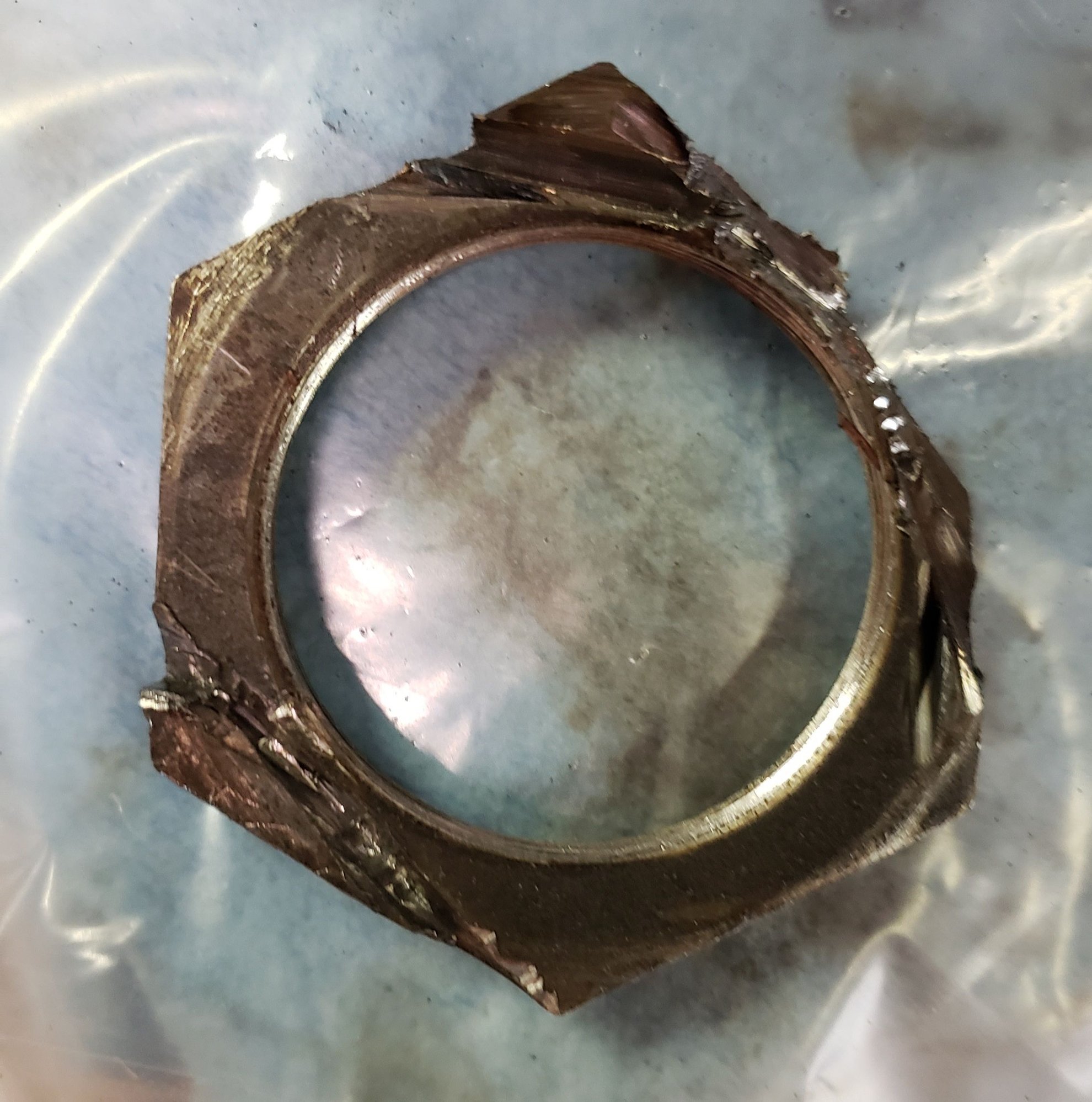 Well it seems like since it is on the lift might as well go all in... Decided to do the 30 tooth pulley swap while I had time so this is the result of a nut that won't budge. 4' breaker bar and 3 & 1/2' feet of pipe and no joy, tried 2 different large impacts and it wouldn't budge. So I decided to make a few relief cuts on the nut and it finally was able to spin off with no damage to the trans shaft or threads.