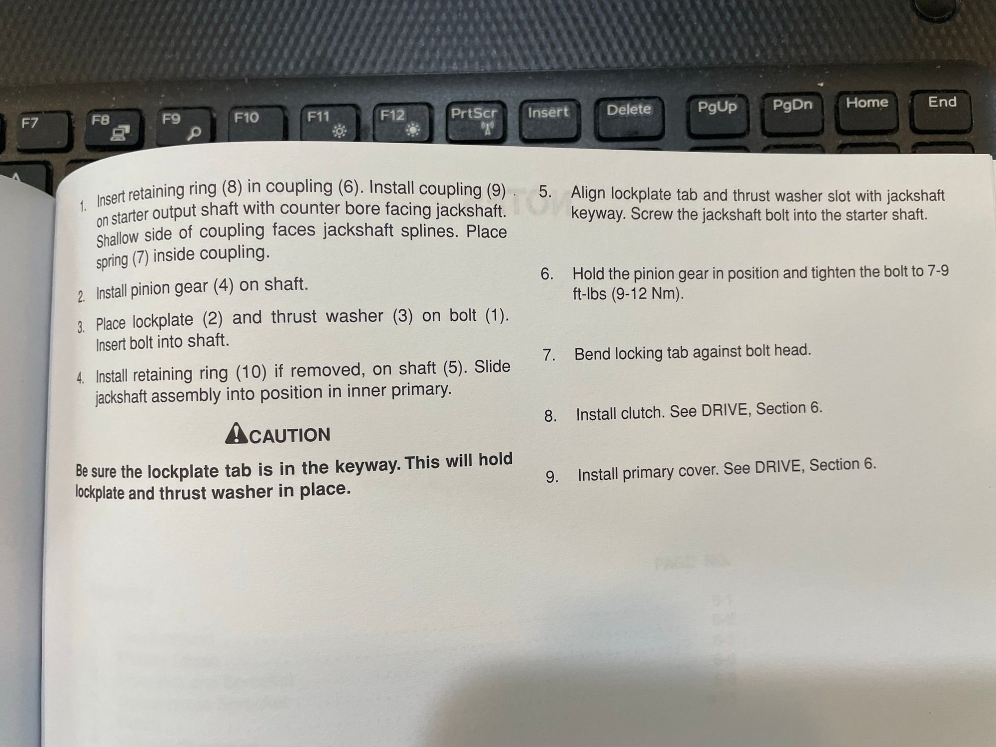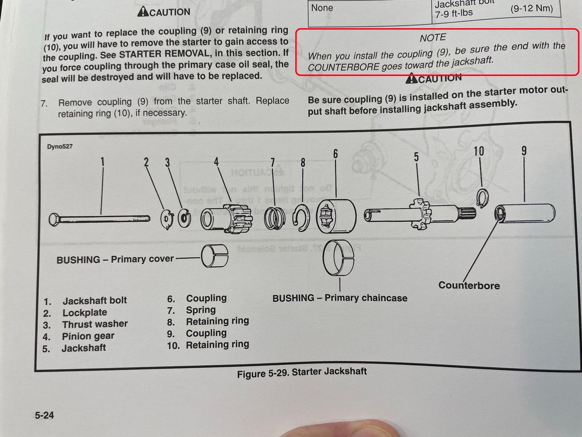 Check the service manual and make sure the starter jackshaft components are installed correctly.