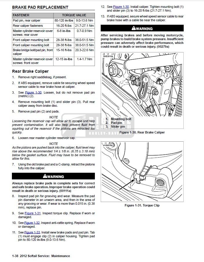 So I am looking for torque specs for the rear caliper mounting bolts as well as the pad pin bolt! Anyone have a service manual for 2012 softails? Can you help a bro out? I am getting many different answers!