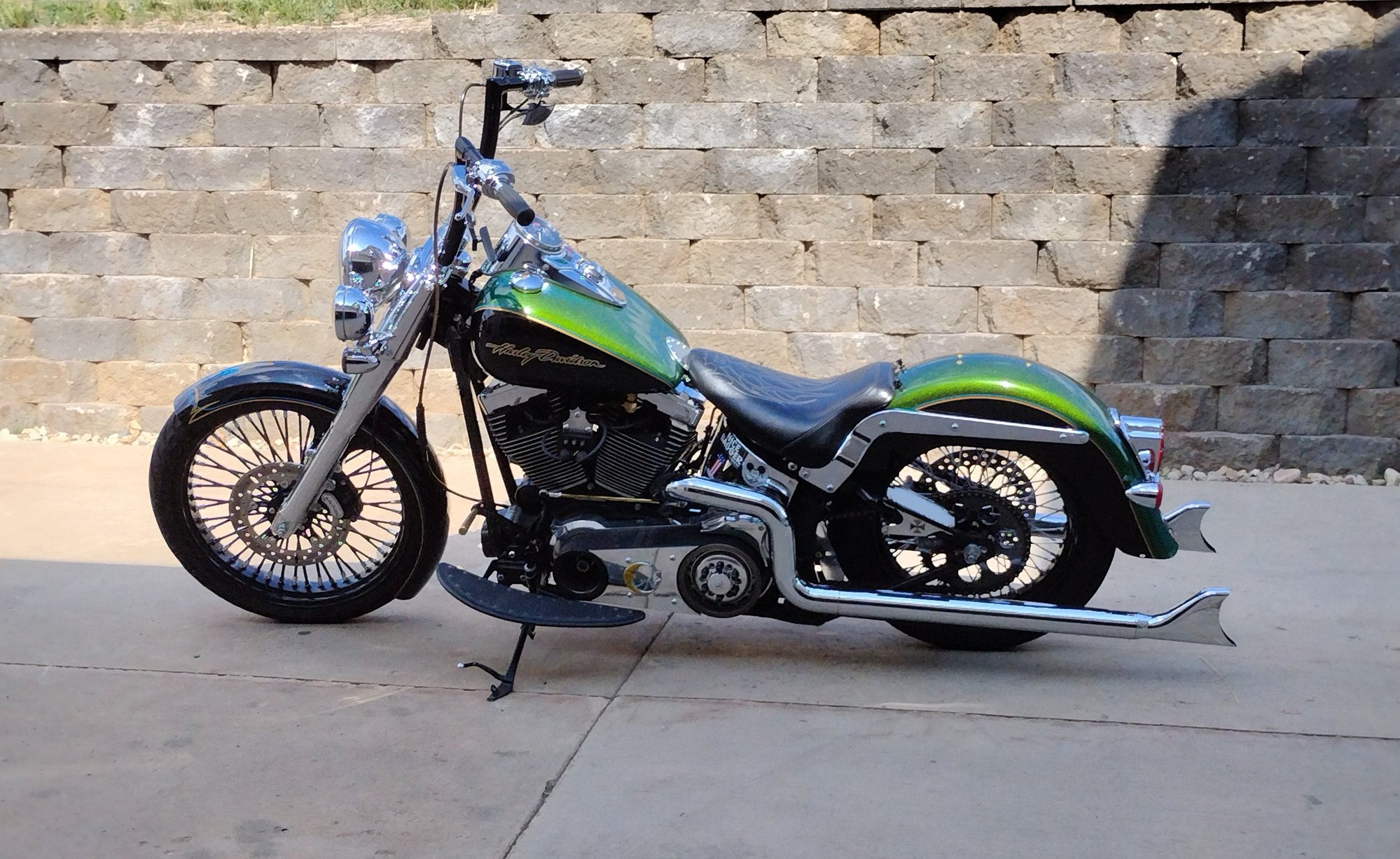 My 04 and my best ridding and golf friend's 07 Fatboy are both about the same. I am able to eyeball about 26 ounces, and spin my home maid sick off bottom of Derby opening. Might add a touch more. Six ounces is less then 1/8" in that level.