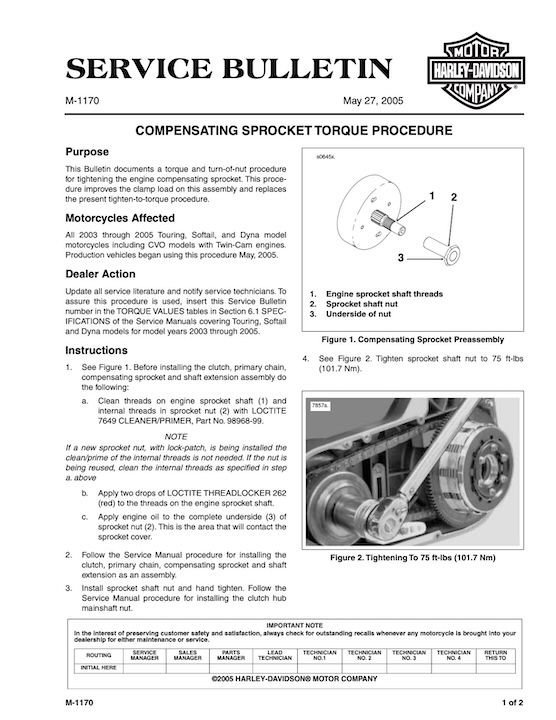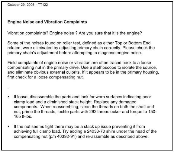 OP, take a look at Service Bulletin M1170 Compensating Sprocket Torque Procedure (dated 5/27/2005) and Harley TT122 Engine Noise Vibration Complaints (dated 10/29/2003).