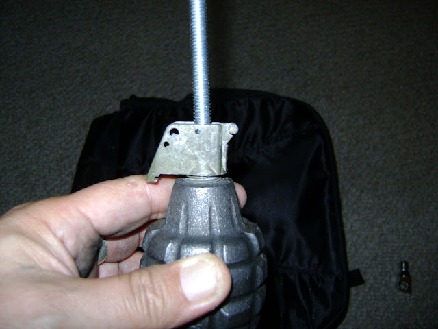 Once you drill out the fuse assembly, reinstall to the grenade body. I used some 5/16ths allthread 20 turns per inch (2 bucks at home depot) and slipped it through the fuse assembly and out the decomissioning hole at the bottom.