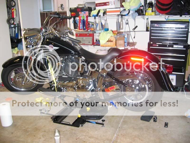 It was the first thing I bought for the bike. I use the jack to move my bike against the wall so I can park my car inside, so I've used it almost everyday since April 2006. The jack is still going strong. I only use the straps when changing the shocks (4 times total), or when every the work requires jerking at a tight bolt. You can also use a car jack under one wheel to give it rock hard stability. 2.5 inches low with stability arms. See my original thread on the Larin jack.