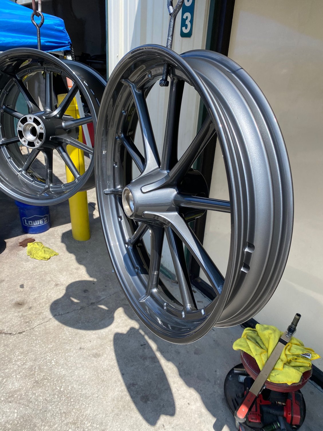 Trim, rocker covers, primary etc...are gloss black. I did the wheels in something called Forged Charcoal. Was considering something more custom for the trim but with my bike being Candy Chrome, I figured it might get too busy looking.