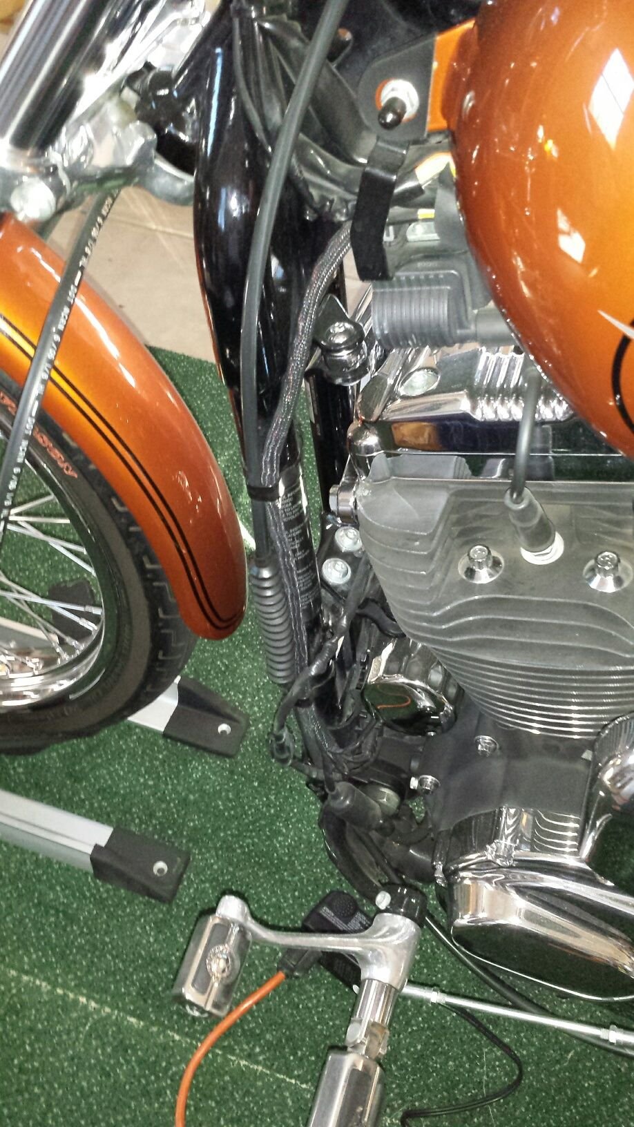Are you serious? It feeds life-blood to your bike, so you can ride! It ain't the prettiest, it must be admitted, but it would take a lot of effort to change things. That braided harness, for example, could possibly get to it's destination by being taken under the tank and seat, behind the trans and then forwards under the engine, but.......