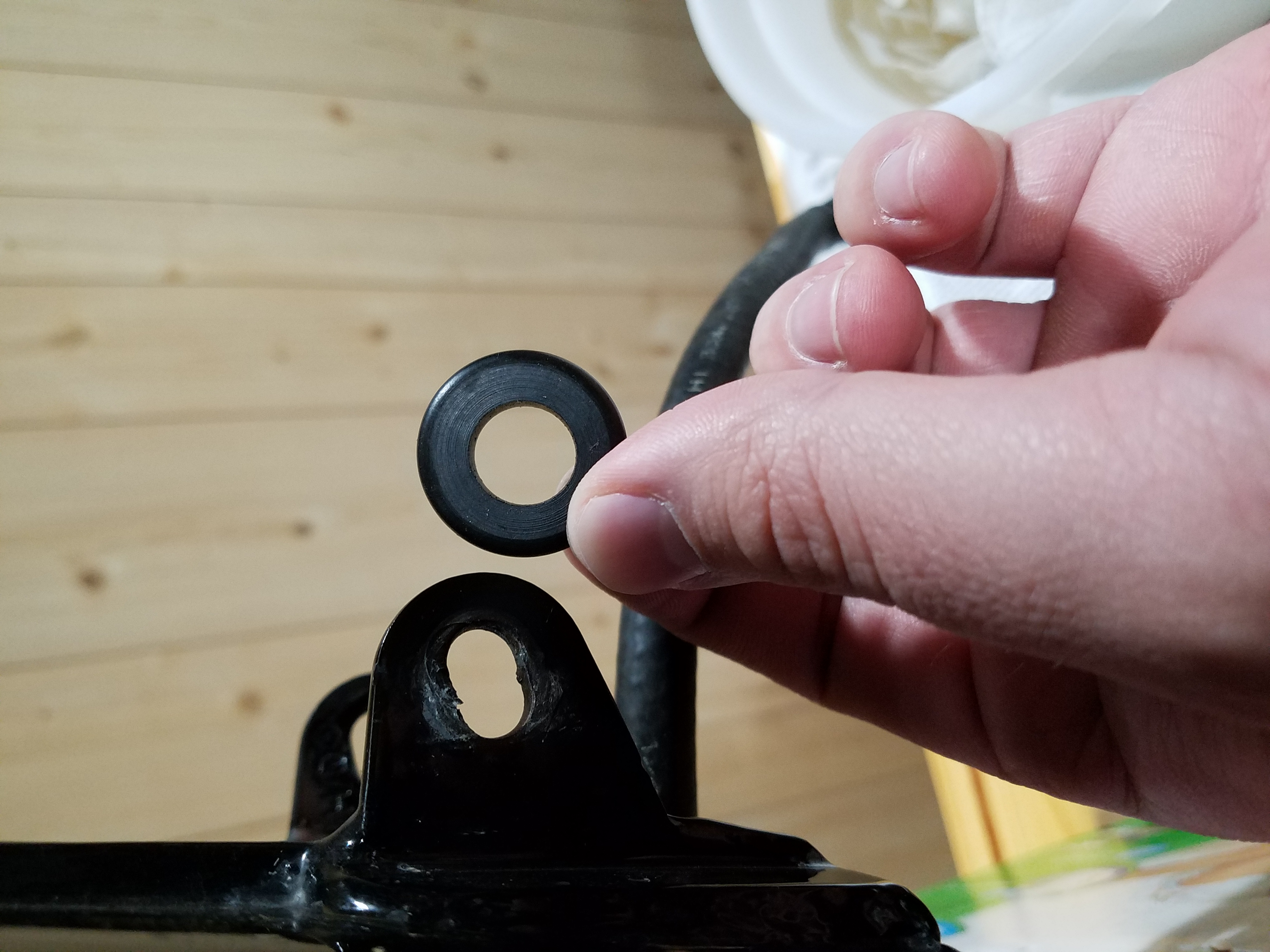 Per the manual: the fuel tank is fixed to the frame with a series of rubber grommets, spacers, etc... that was not the case when I took the existing tank off: it was held on by naked nuts & bolts.