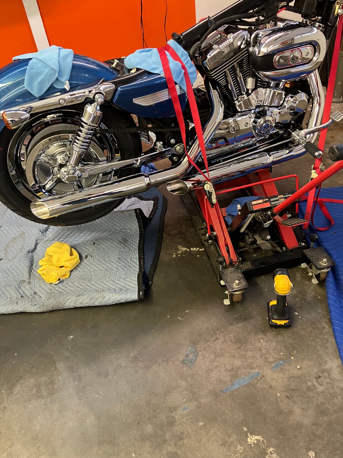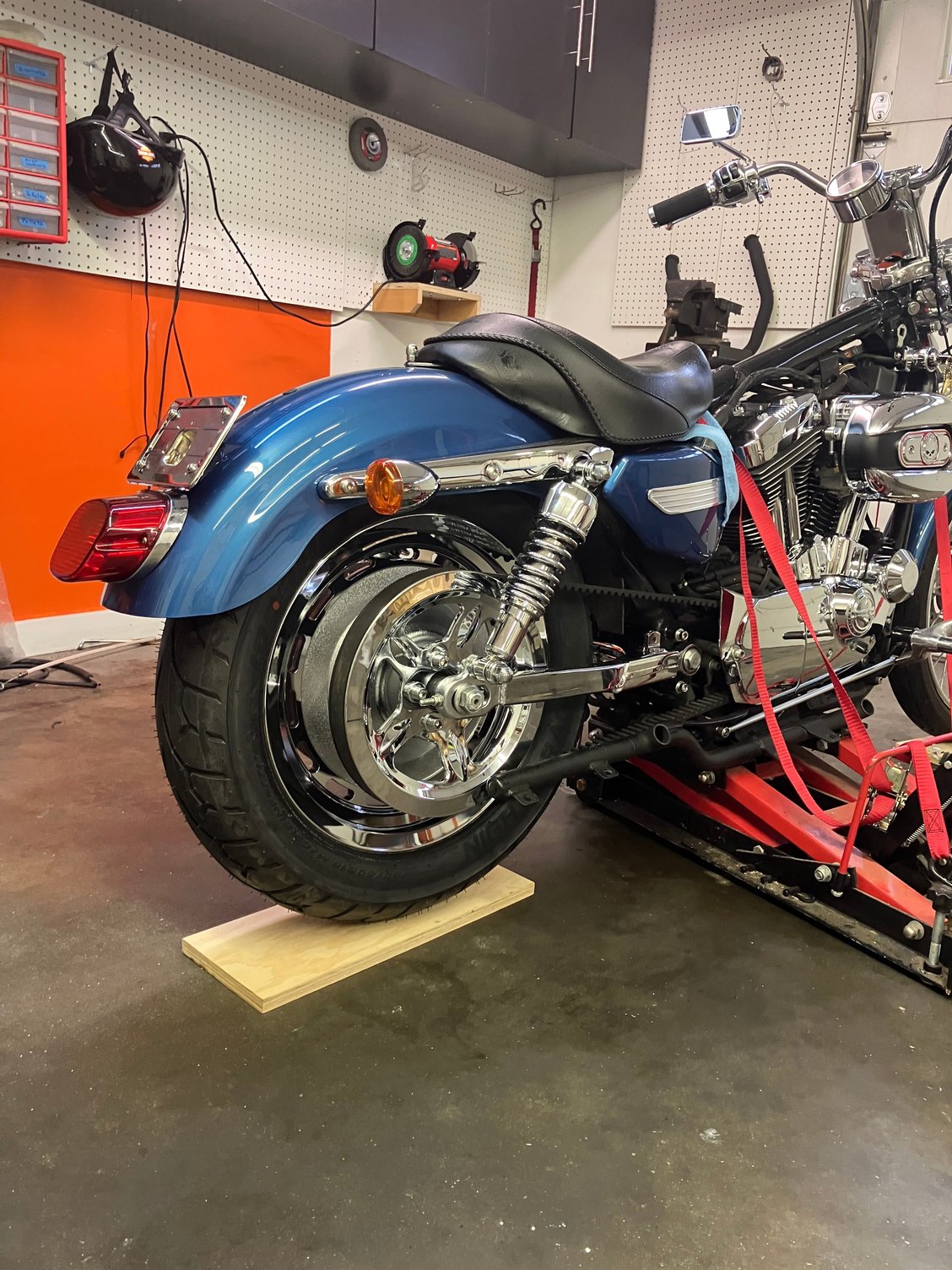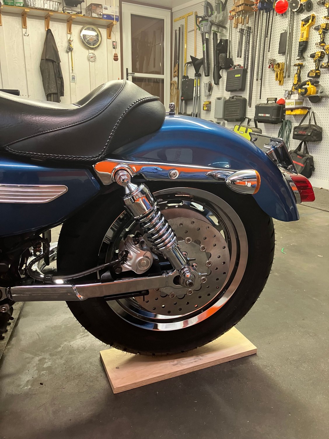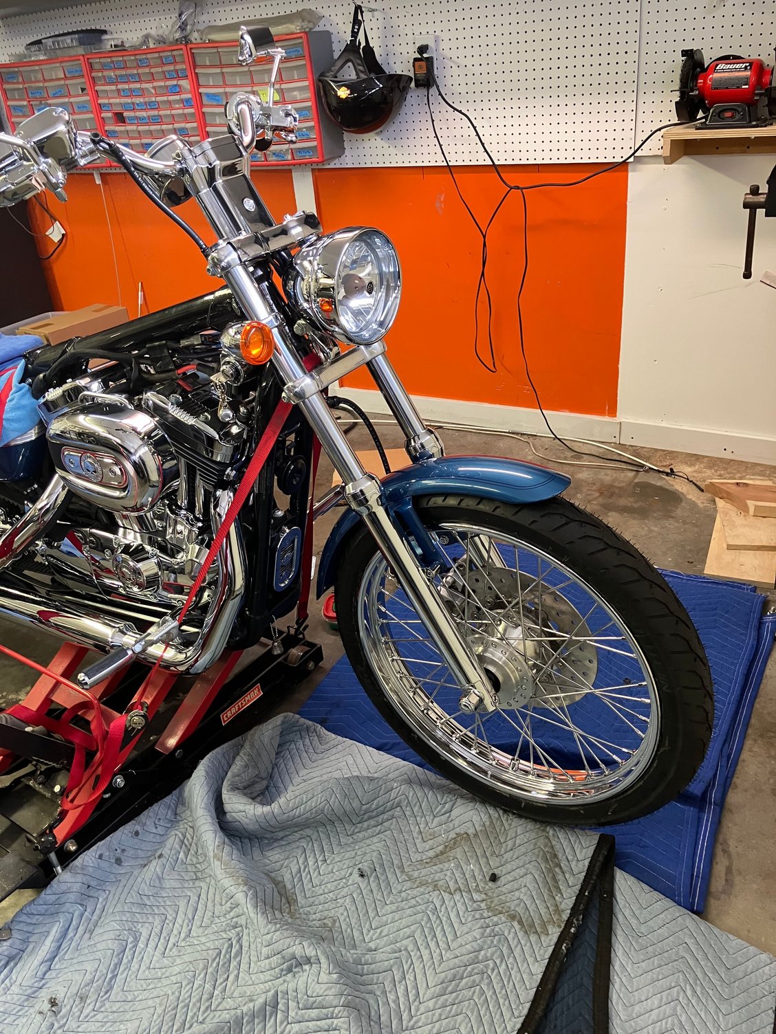 This weekend I got the front end rebuilt new chrome lowers, progressive springs, new oil, new seals, new tire, got the clutch and throttle cables installed, also got the primary lube changed and adjusted the primary chain.