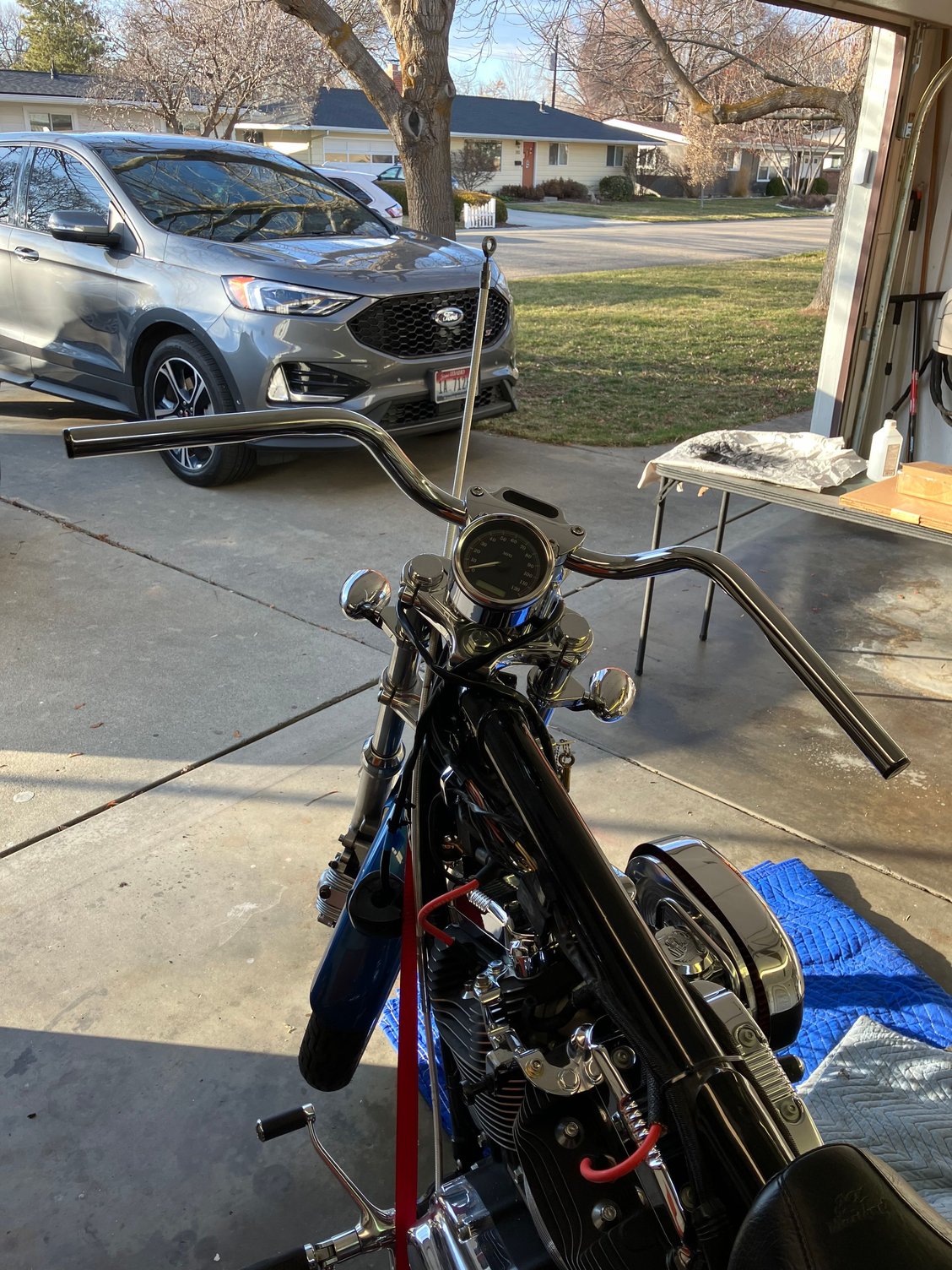 I also test fit the new handlebars I got this week, they seem to fit perfect. I converted the riser from the bent riser on the new bikes back to the straight style from an older bike (I really don’t like the new bent style). Next weekend I’m going to drill the handlebars for internal wiring and I have a new set of chrome controls to install, that should keep me busy for 2 days.