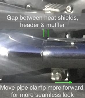 When I first put these on, I did a post (either here or on another forum) and talked about how the position of the header clamp affects how well the muffler heat shields dovetail into the header shields. (see attached) I was inclined to slide the clamps forward for a more seamless look on the shields. But this time I erred on the side of the better seal, and it once again looks like the picture. The clamps need to be closer to the joint, I think.
