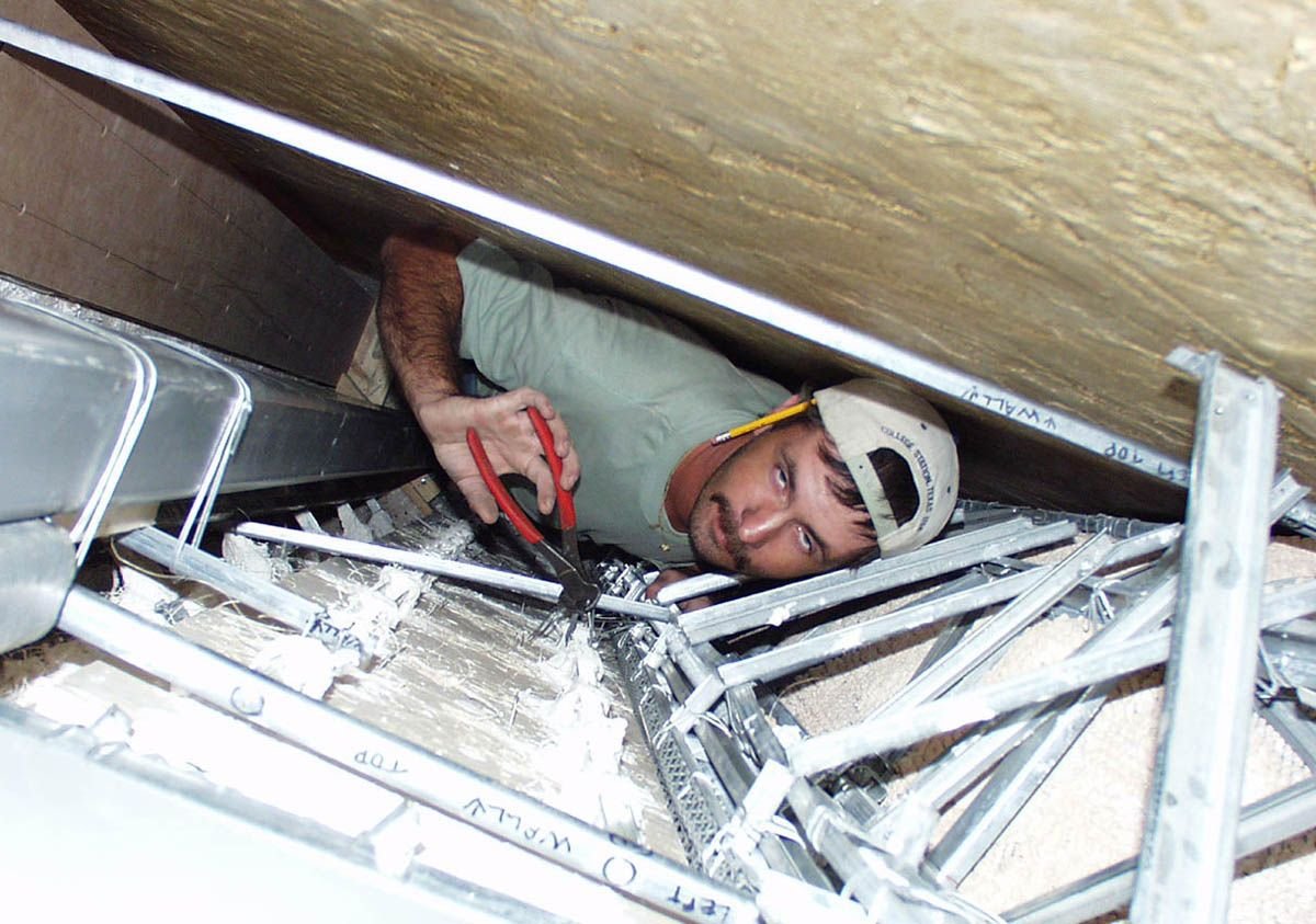second picture, the skinniest of the bunch gets to climb down behind and tie some pieces together.