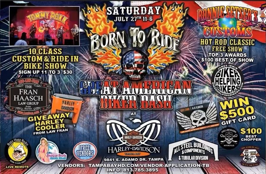 2. Born To Ride Great American Biker Bash! I've been to a few of these in past years and they've been pretty good. However, this is the first time it's being held at Tampa Bay HD, formerly HD of Brandon, and they aren't really known for their ability to present exciting and dynamic bike nights or events in general. Hopefully B.T.R. can generate enough energy to make it a success.