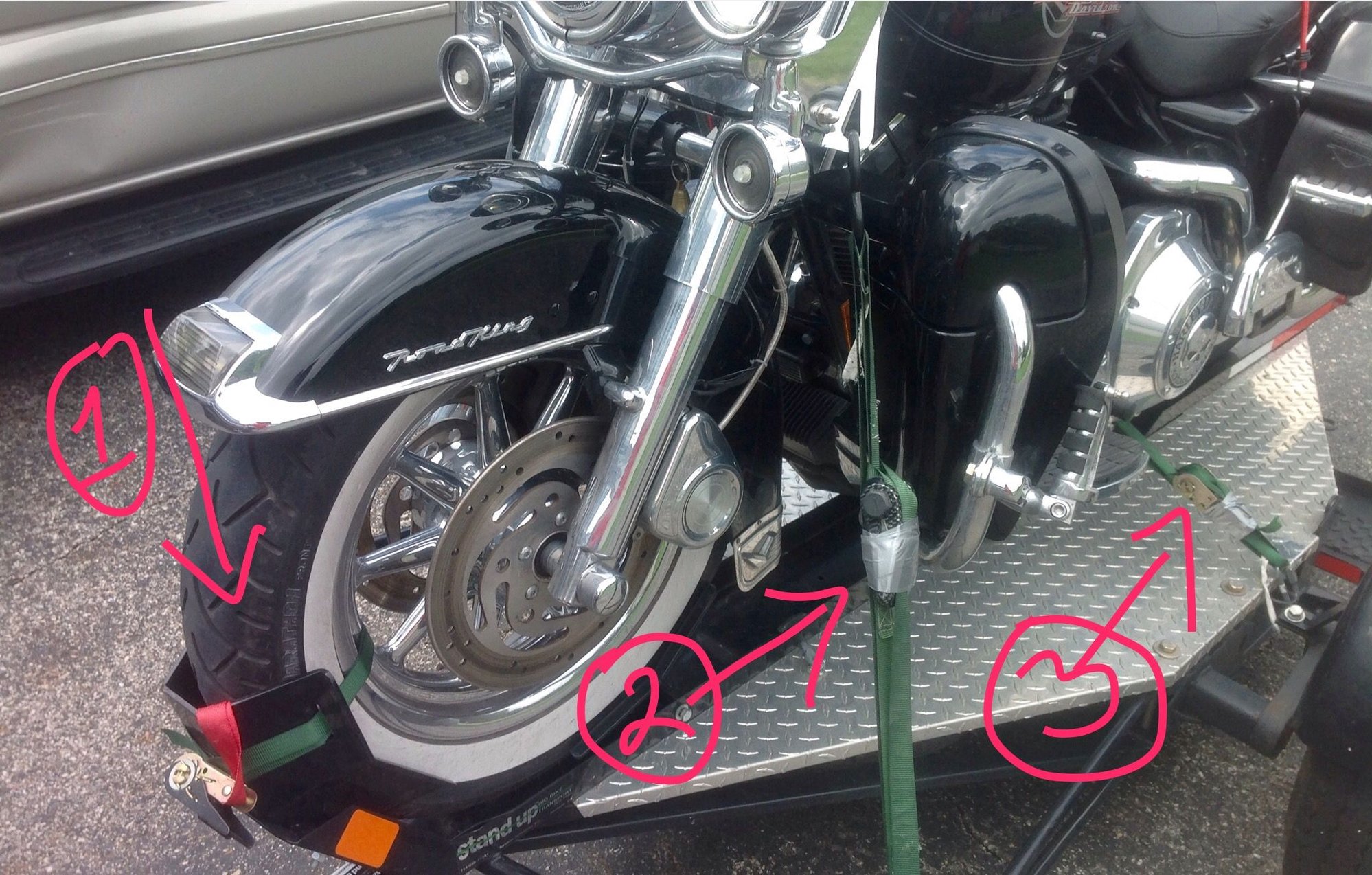 Couple straps around the passenger foot pegs kept 2 bagger rear ends straight which is critical considering how skinny that load ramp is (assuming you have the walk up Kendon) If that rear end moves too much the unloading process gets much more interesting.