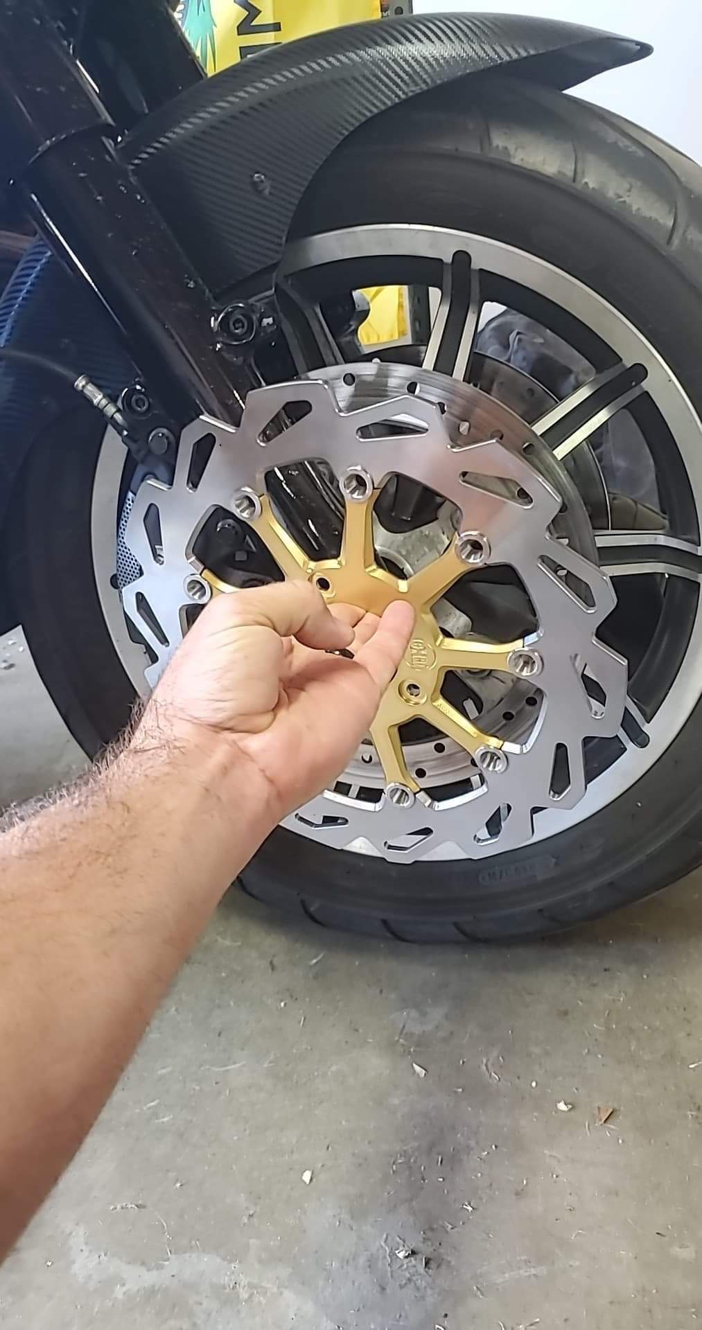 For all you wondering about the Chopper Hauss rotors. Got mine delivered today. I was going to post video of the unwrapping but its in the wrong format. Lame. But here's two pics of the mock up on old and new wheels. Upon initial review. I started getting wood. These things look legit. Very good quality. Waiting on black rotor bolts to arrive. As soon as they're mounted, I'll post more pics and an initial review after a short ride