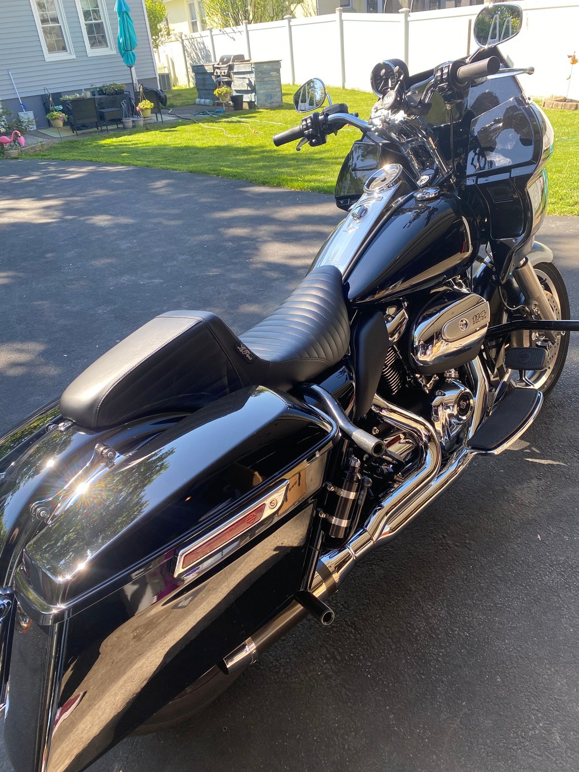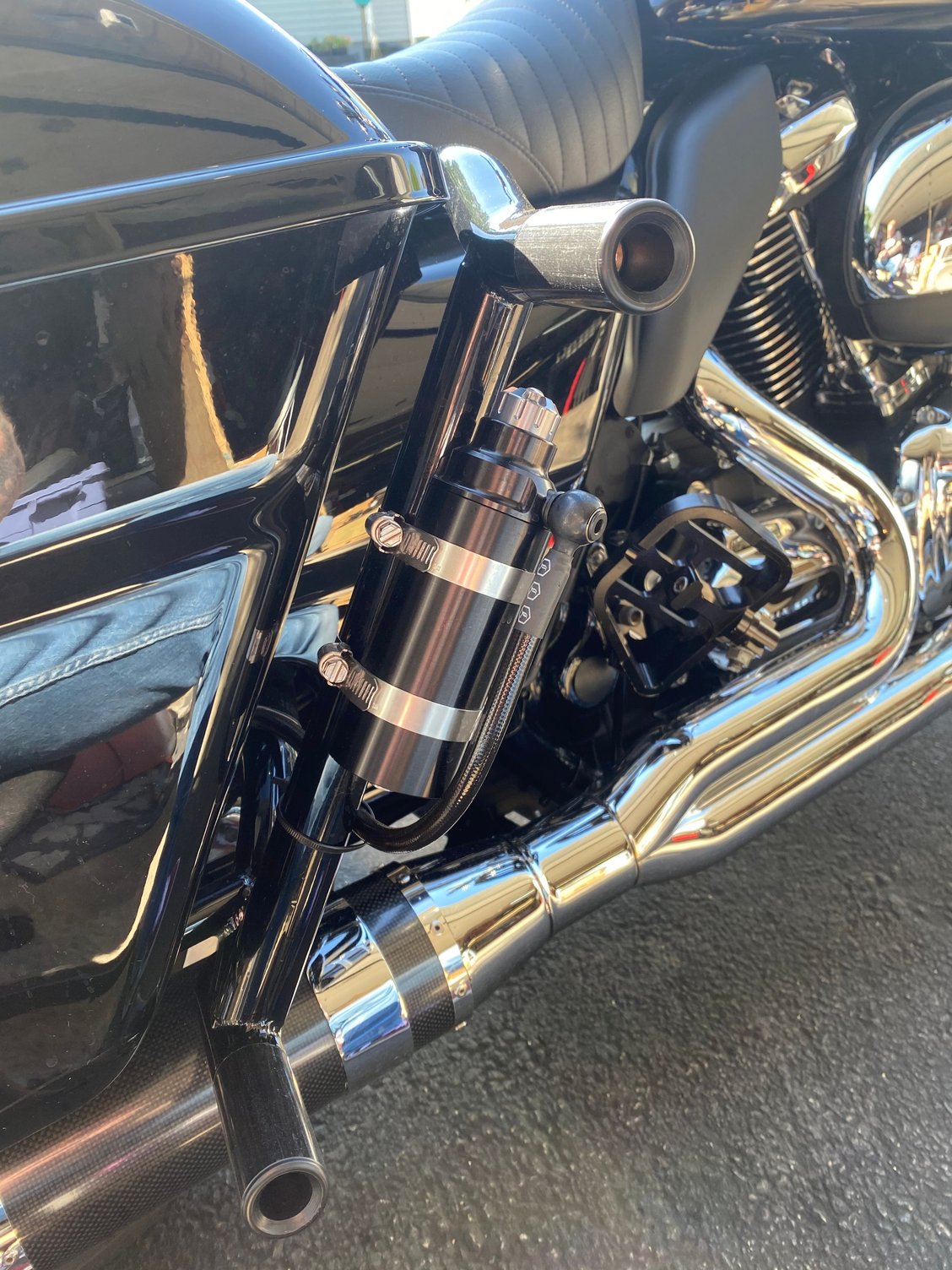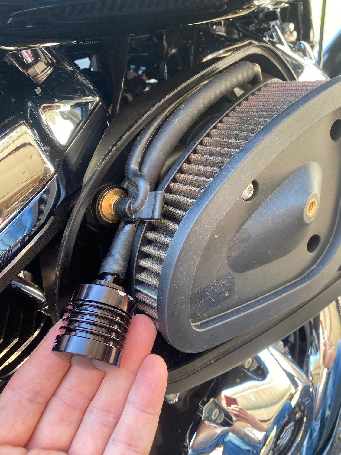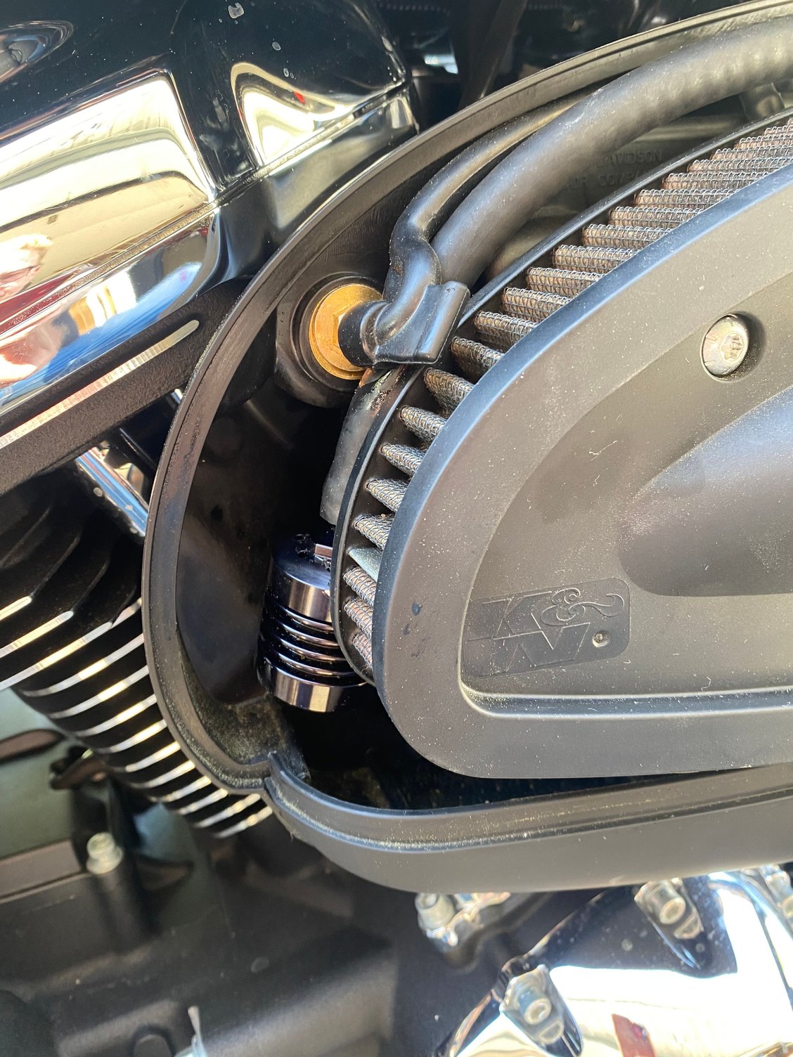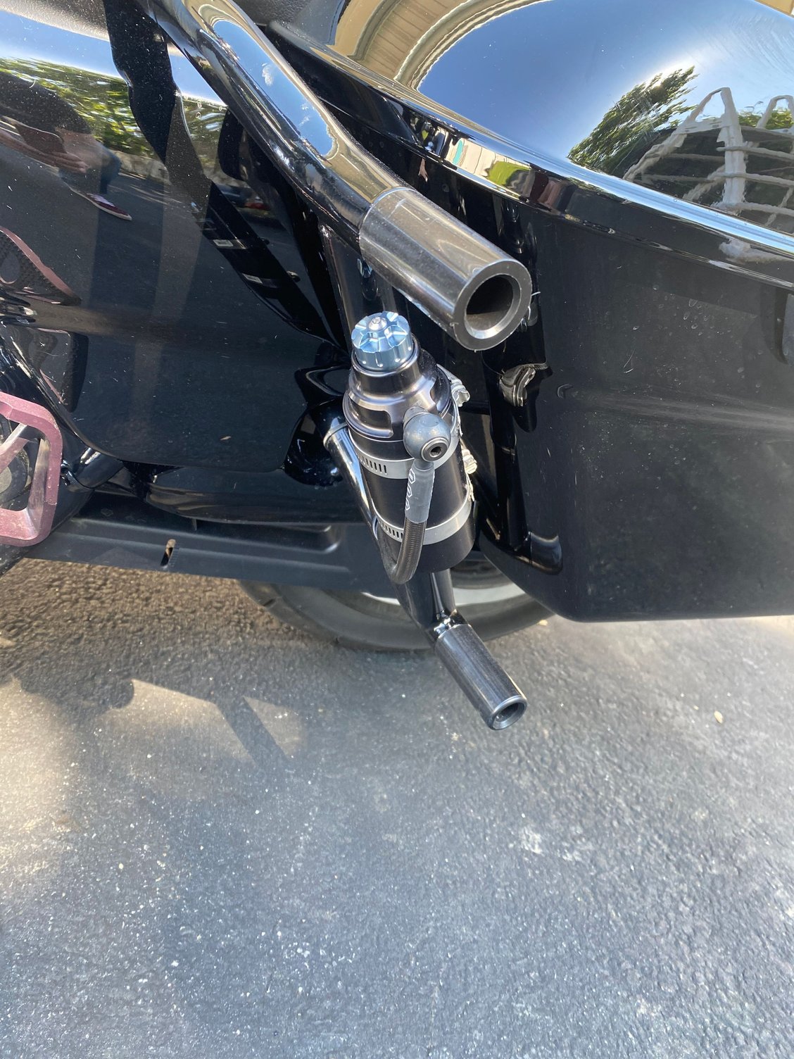 Here's an update on my FLHP. Since I got it home I simply took the existing breather hoses and put them inside a 3/8" hose and ran it to a Golan ($46 on eBay) breather/filter/catcher and just tucked it inside my stock air cleaner housing. I kept the stock air box and just replaced the stock air filter with a K&N inside. I put on a new set of Legend Arc with remote reservoirs. I installed them upside down because the **** for the rebound was under the bag and not quickly and easily accessible on the fly while sitting on the bike. Now I can just reach back a little and adjust them with 1 finger. The reservoirs were supposed to be clamped with the supplied billet ones between the bags and rear tire with the ***** facing out and rearward. Also not quickly accessible on the fly, and I hate the way they look back there like that. I took 50 cent stainless hose clamps and mounted them on the Santoro Fabworx crash bars. All adjustments for different riding and passenger can be done from sitting on the bike.