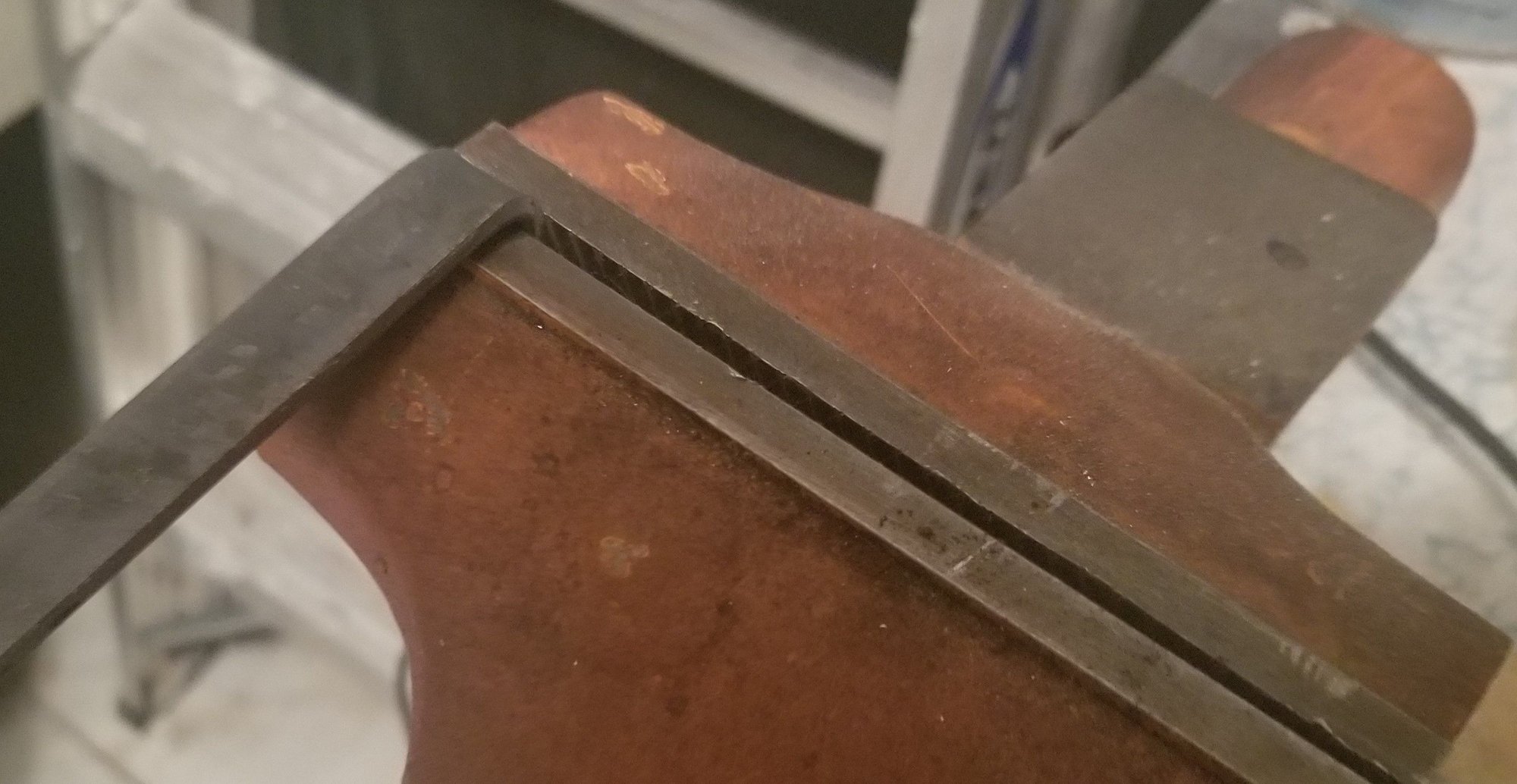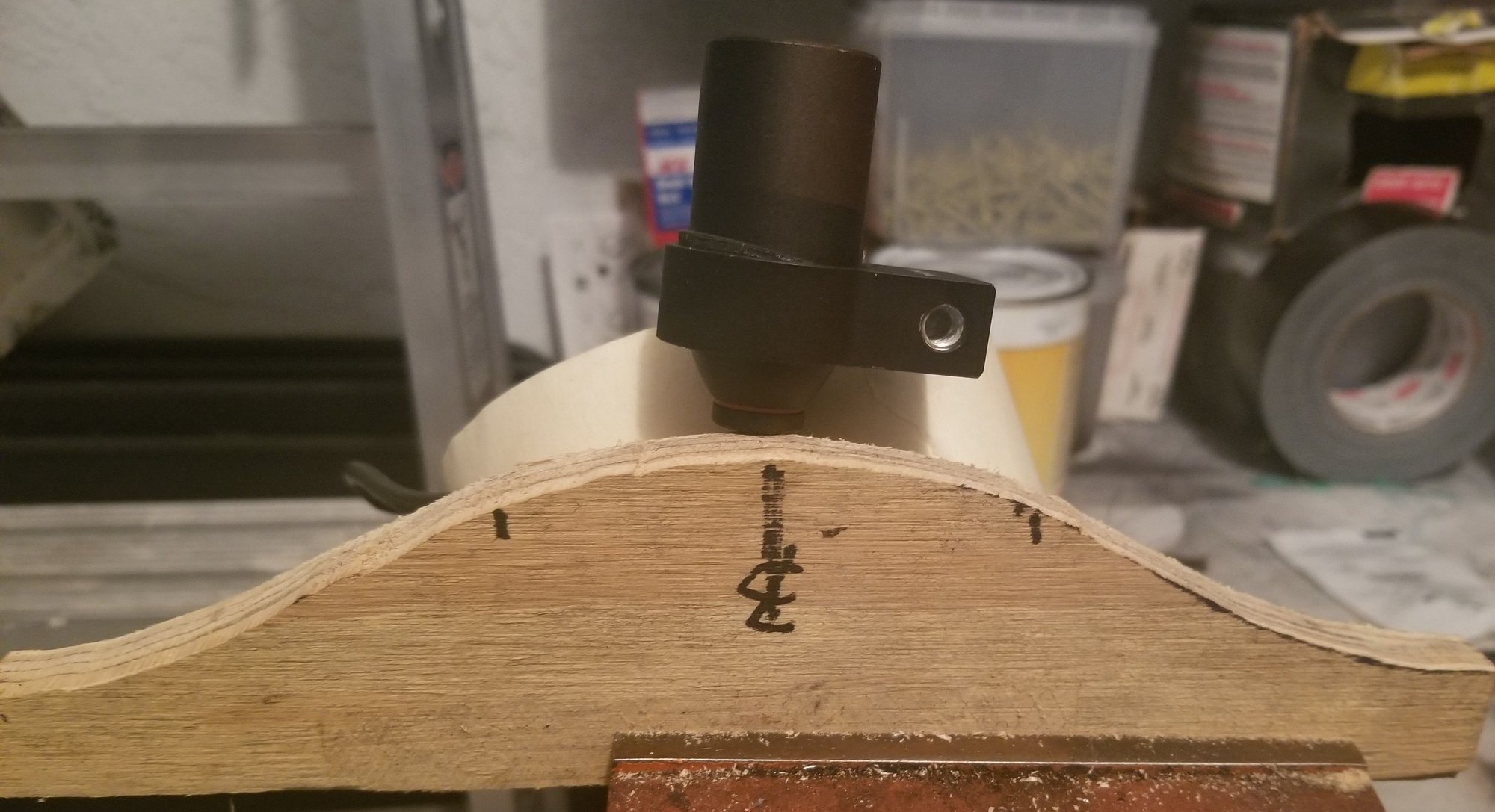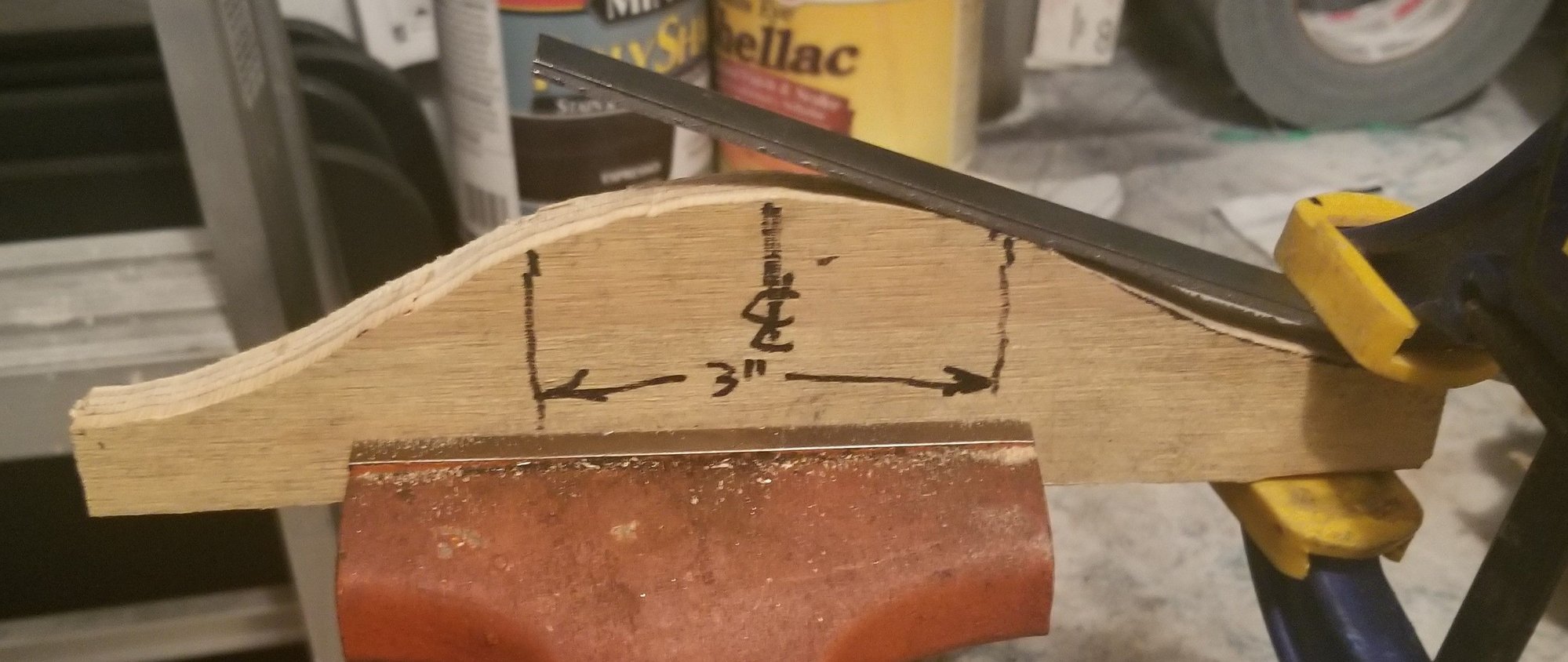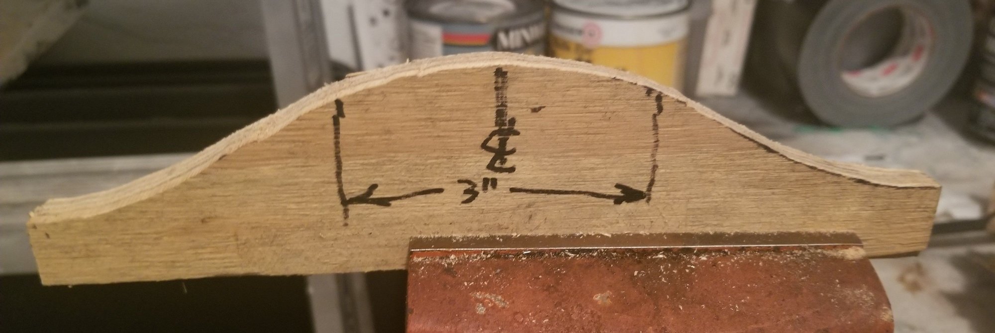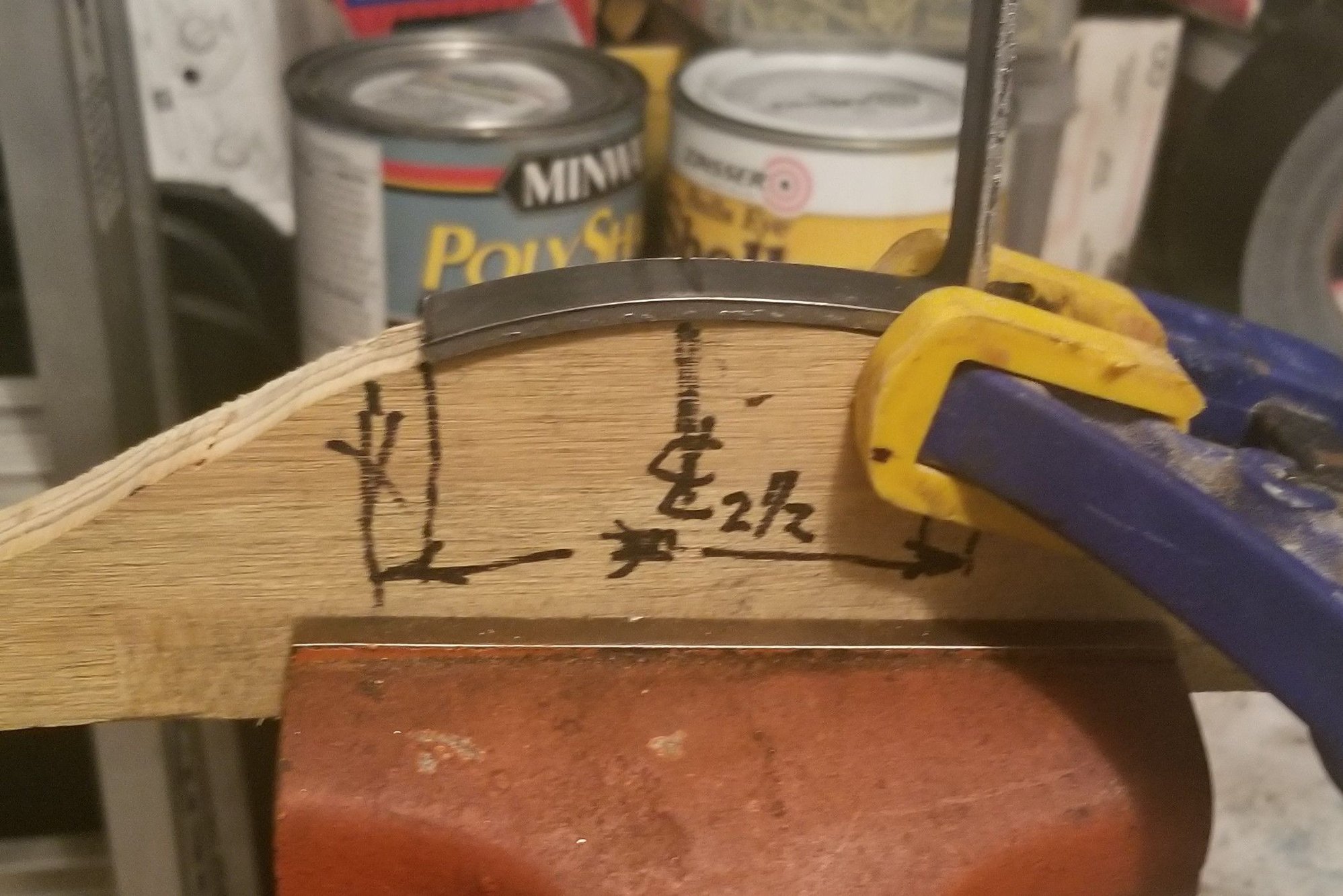 Step 3. I established a centerline at the center of the curve. This is where the camera centerline will be located. I first estimated the curve part to be 3 inches long along the curve. Clamping the flat stock to the board, I used a small sledge hammer to bend the flat stock to match the curve of the wood.