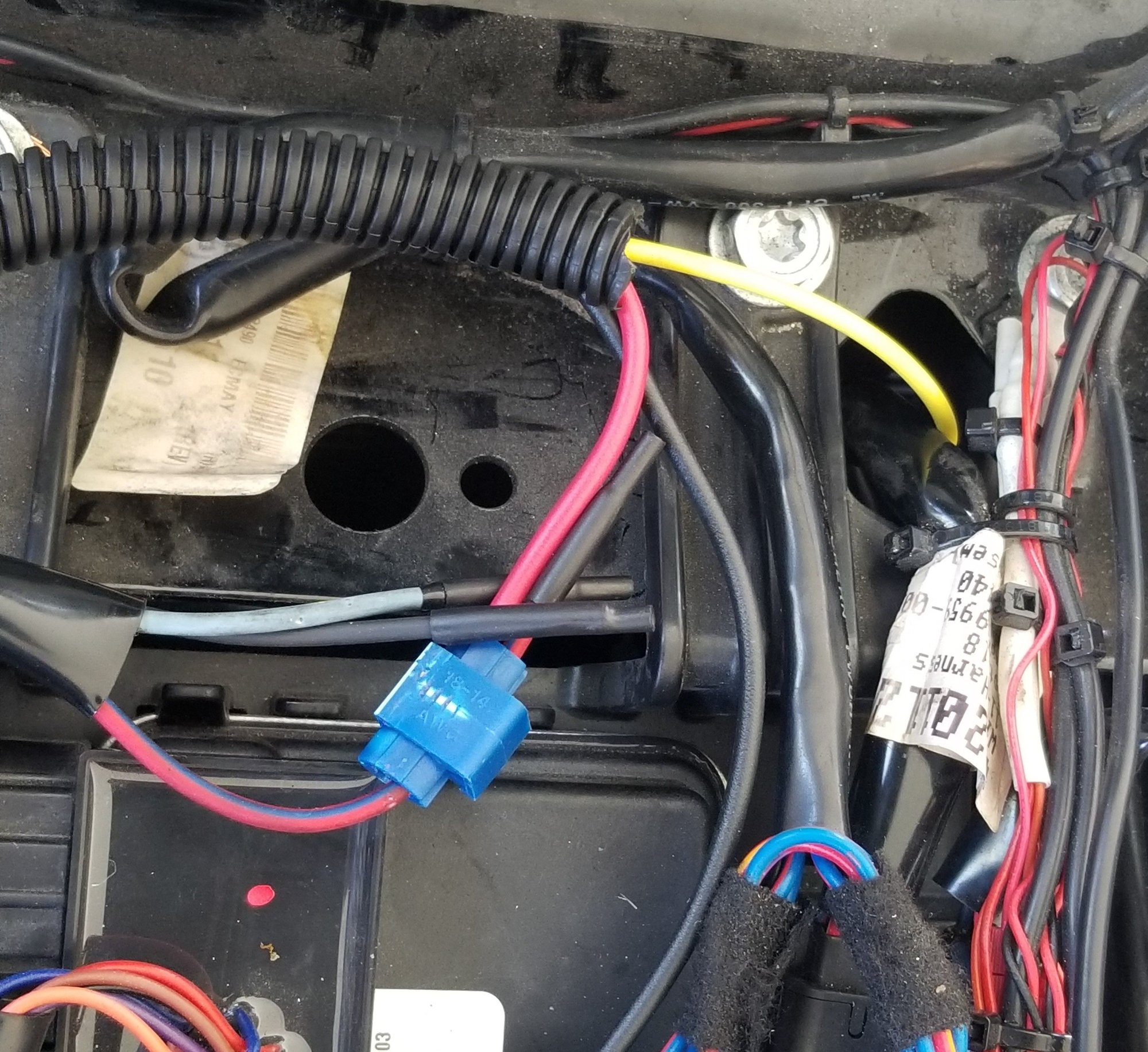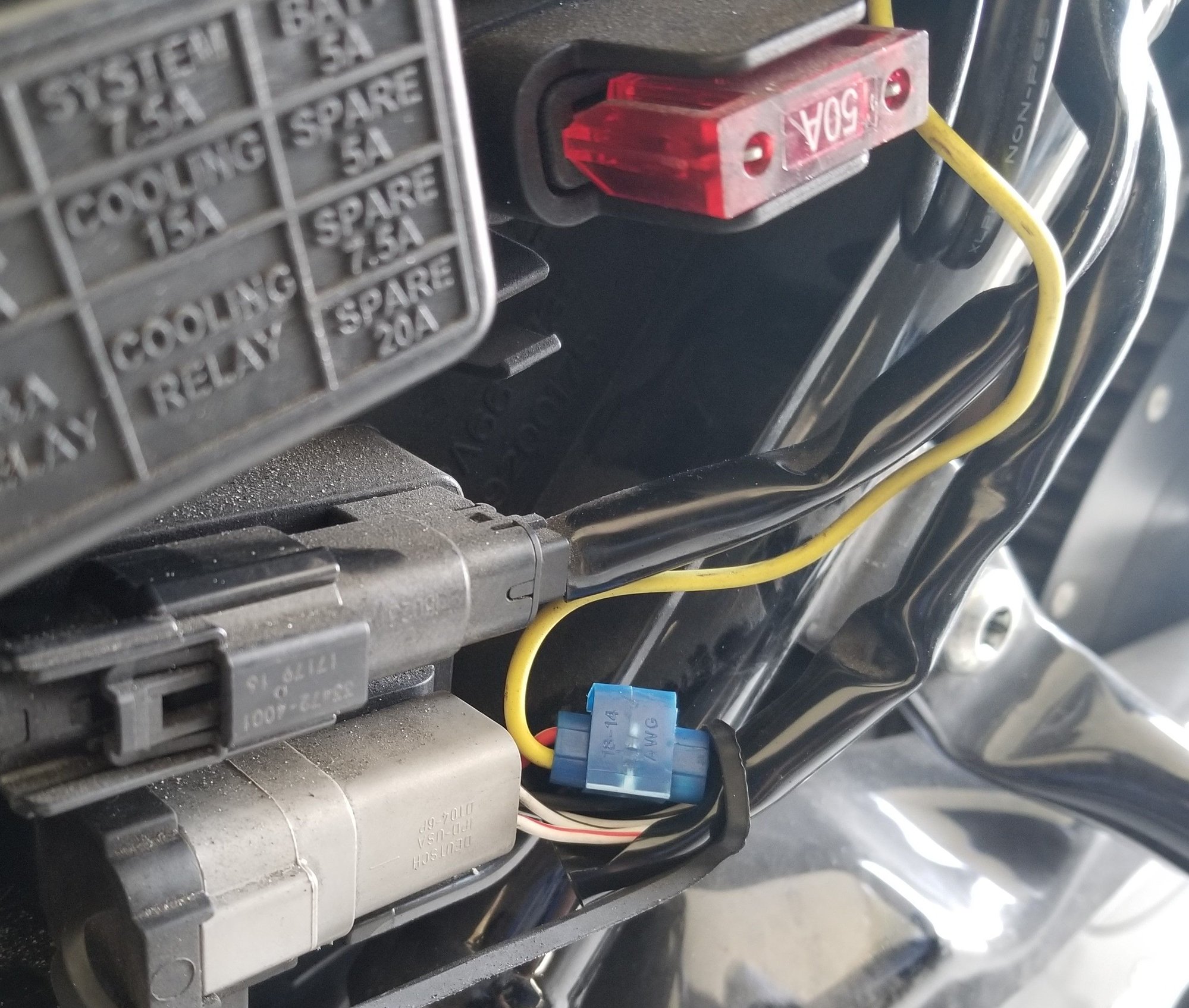 Under seat Red wire from power module connected to unused red/blue fused wire in Accessary 2 harness. Black run to ground. I had some difficulty finding a path to get the Yellow down to under the left cover to a switched power source.