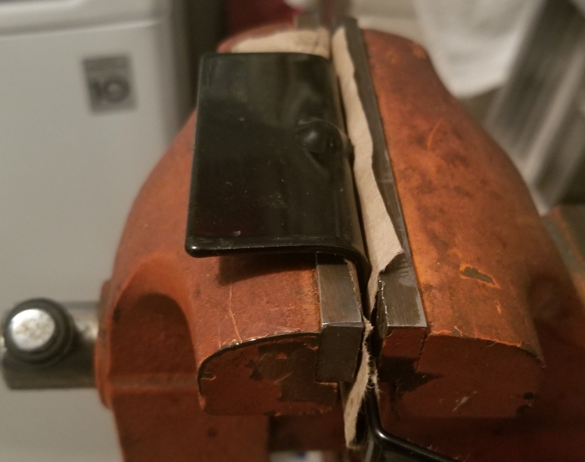 Step 5. I bent the flat stock at the end of the curve 90 degrees by clamping into the vice and bending using the sledge hammer. The bend is away from the concave side so it protrudes out from the mounting surface.