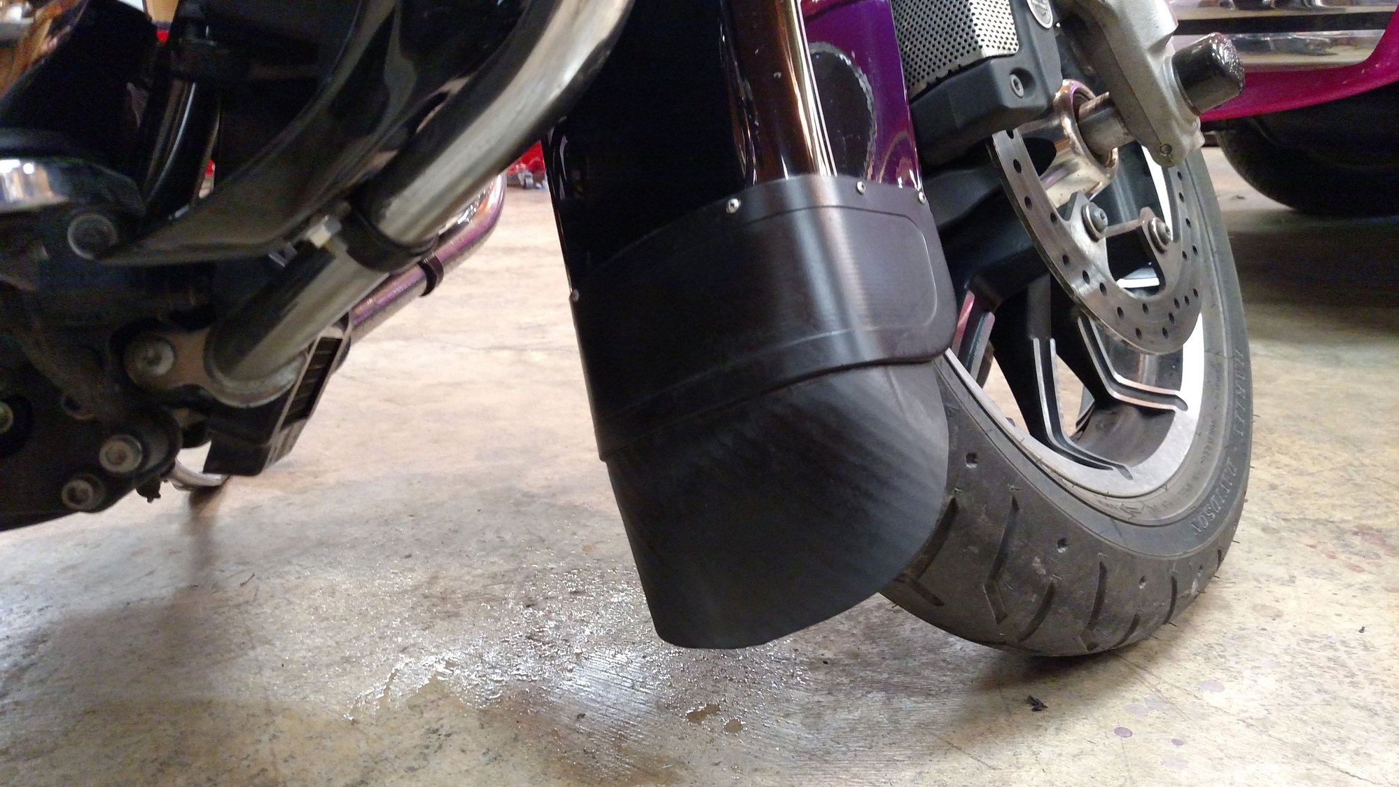 Speaking of cheap, instead of buying HD's $40.00 front axle covers, I made some out of PVC pipe end caps I had laying around the shop. Put some Bondo in each one and shoved them over the axle ends and held it centered there for a few minutes. Once it set up I pulled them off, drilled a small hole for a set screw and painted them black. Bingo! You can't tell them from the HD product. (See photo below. You'll also note my cheap mudflap I made out of a piece of truck tire inner tube.)