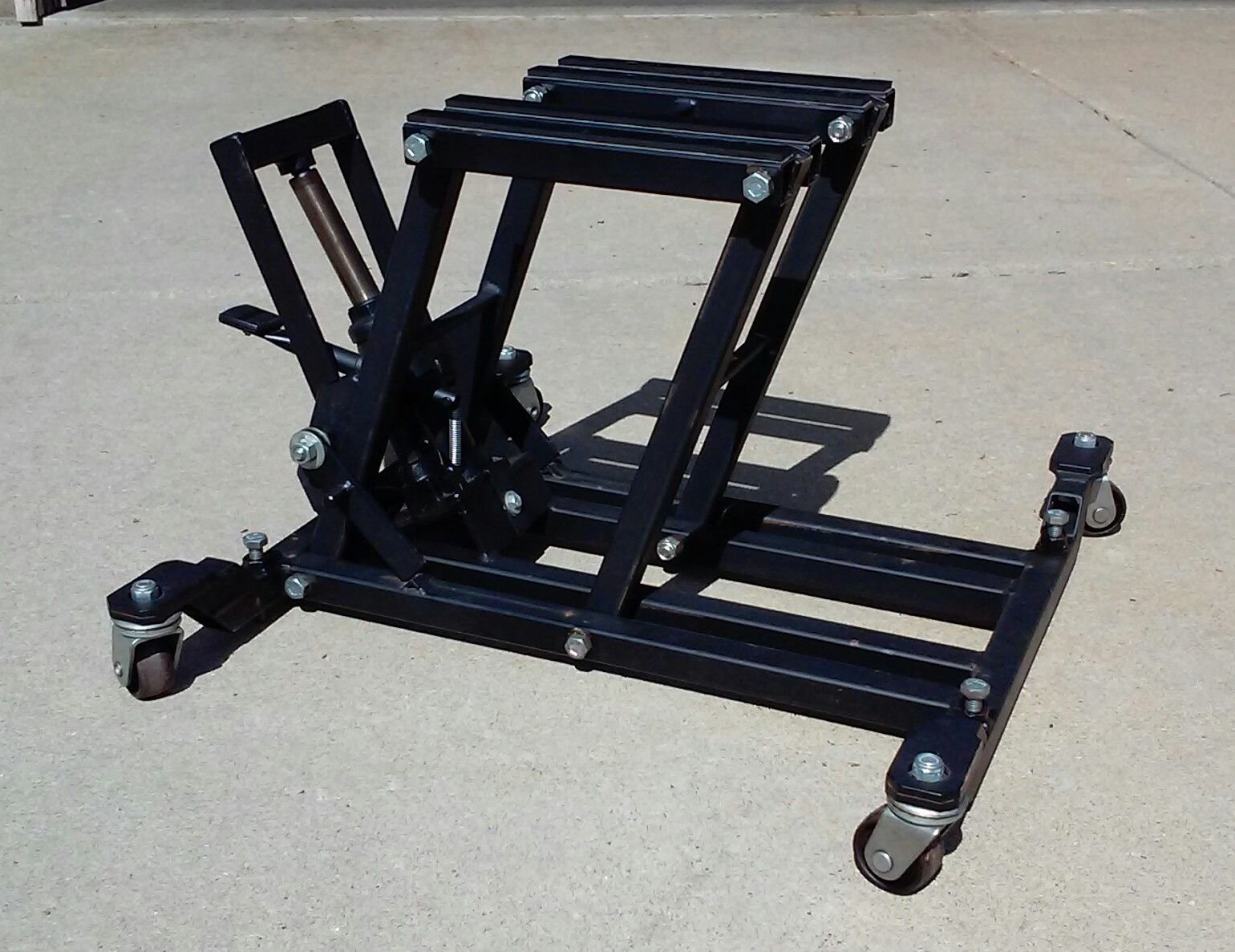 I refuse to pay someone for a well known design when I can fabricate my own for a fraction of the cost.. $80.00 in materials including the steel, 2 ton bottle, four swivel casters, grade 8 hardware and paint. Collapsed height is 4.5", raised height when locked is 18".