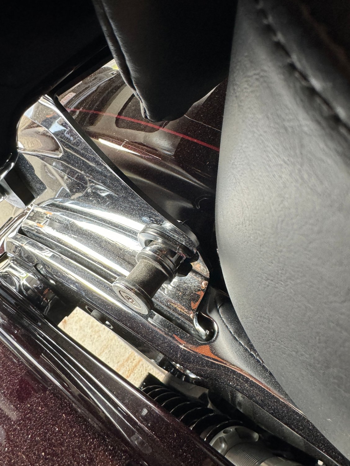 Firstly the .650" diameter black delrin spools on the front of the docking hardware were outboard of what appears to be .750" diameter chrome spools/spacers while the .650" diameter black delrin spools on the rear were mounted inboard with no chrome spool/spacers so the front and rear black plastic spools were offset by the distance of that .750 chrome spool/spacer up front while the Hogworkz mounting plate was an inline affair where the front C notches only measured .700" (to small by .050" to fit on the .750 chrome spool/spacers) but the rear locking clips did fit the .650" rear spools just swell so what I did to get by the pinch I was in was I pulled the front .750 chrome/.650 Black delrin spools and reversed them getting the front black delrin spools inline with the rear and now managed to get the pack mounted but leaving me with a bit of slop up front with C's that are a bit larger than the black spools they are mounted to and that slop translates to an excessively bouncing tour pack at idle.