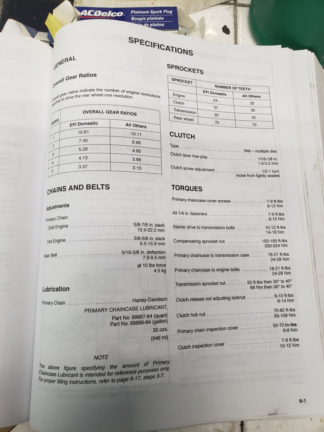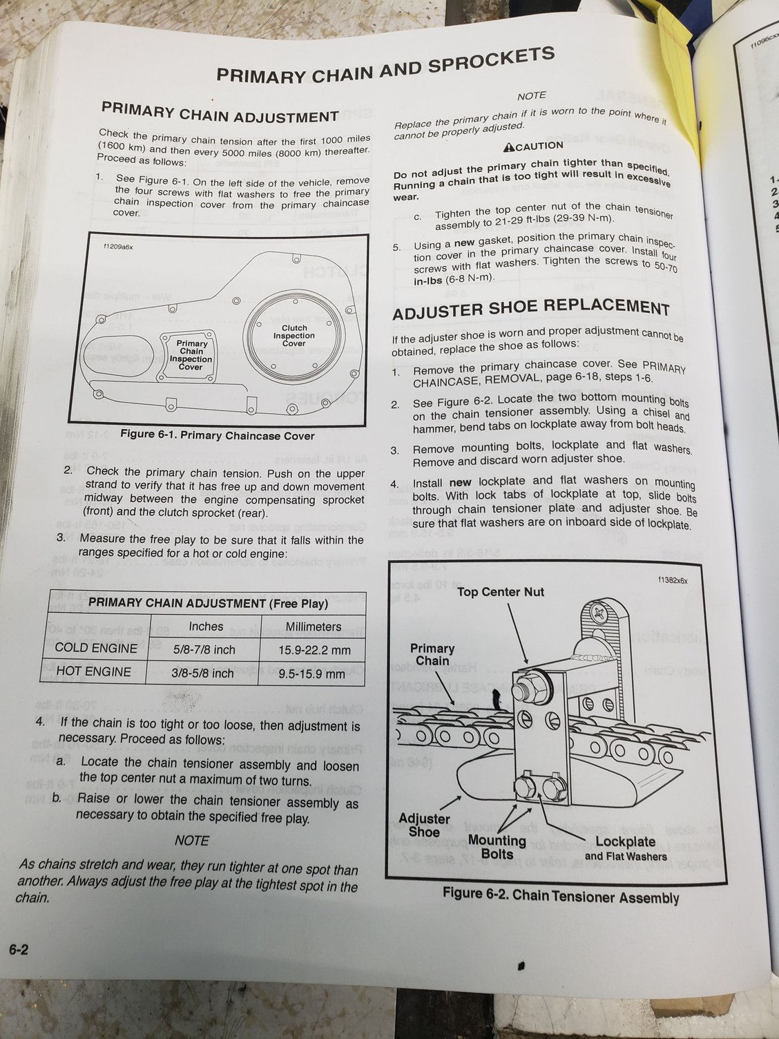 I pulled the primary cover off and the chain tension itself looks okay and within spec; however, as I was looking everything over I noticed that the front bolt on adjuster shoe was loose. Loose enough that I can rock / wiggle the shoe up and down. I bent back the tabs and I tightened both (2) of the shoe bolts down tight. As I was bending the tabs back to lock into place I had a thought about torque specs and now I'm second guessing myself!