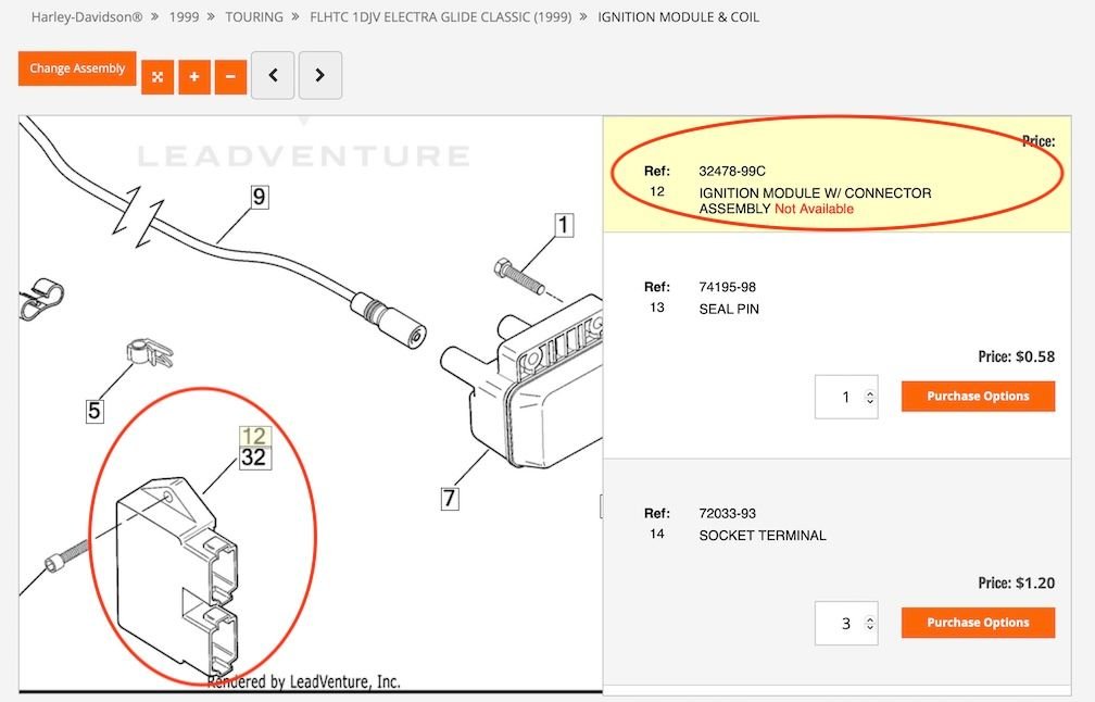 Your carbed bike doesn't have an ECM (electronic control module), those are for EFI bikes.. Your bike has what Harley calls an "ignition module".