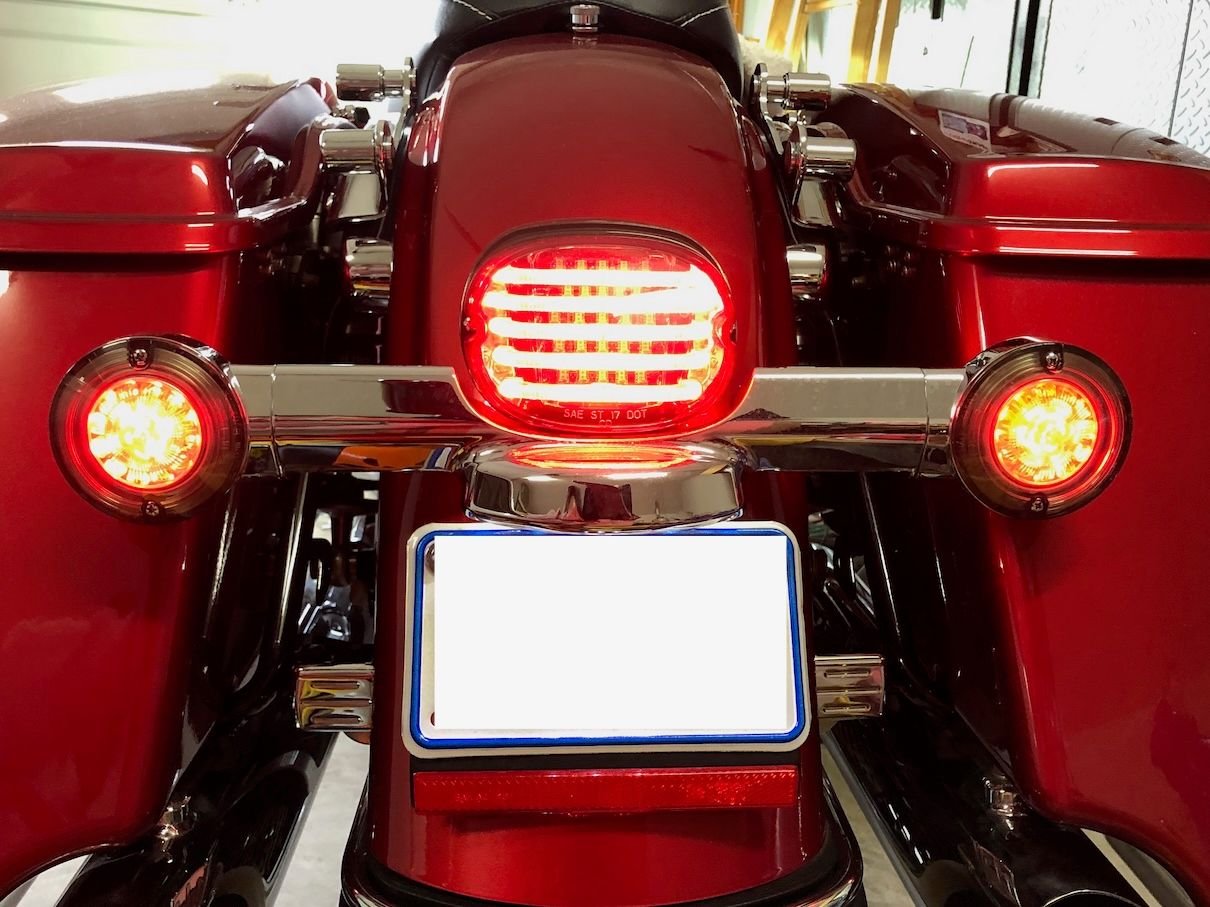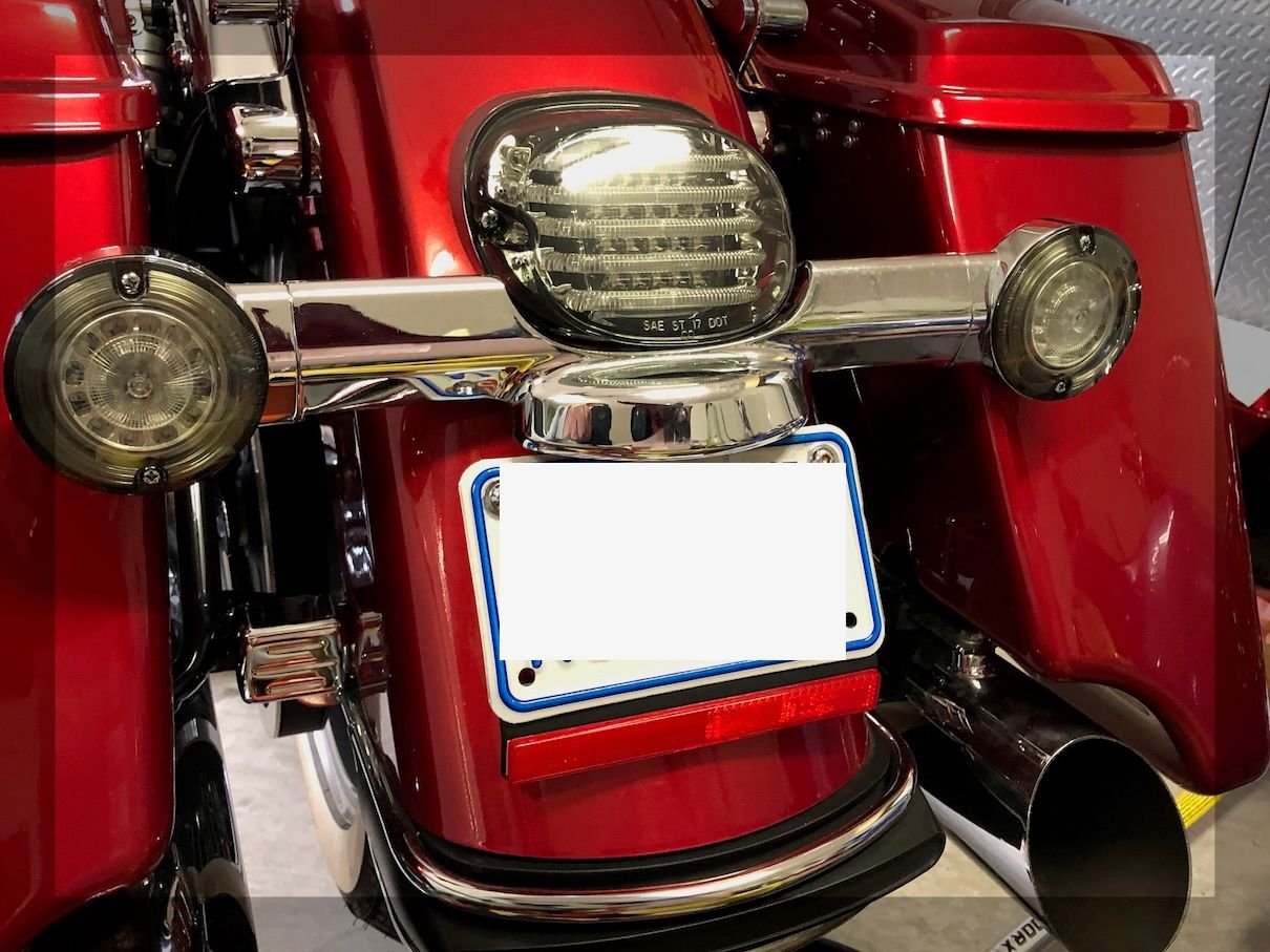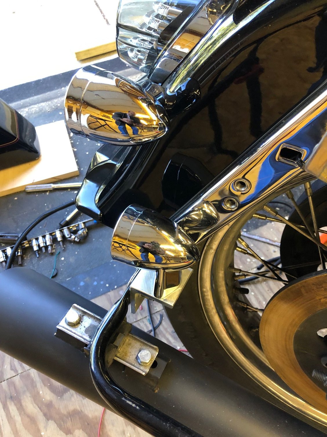 I don’t have the tour pack on right now, but this is what the back end looks like. The original owner added these turn, signal bars that have lights built into them. I’m not sure if I can switch those out for LEDs in there also