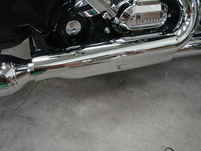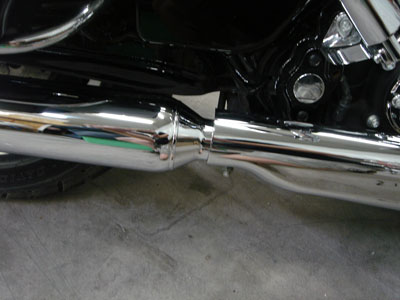 Here are a few pictures of the heat shield installed on the Jackpot 2/1 head pipe. As far as the inlet collar fitment it is a bit different than the stock pipe, unlike the tapered stamped inlet collars on the stock headpipe our collars are CNC machined to exact tolerances and are precisely matched to the exhaust port dimensions. When you fit the pipe you will see the billet collars are only slighly smaller than the machined port diameter and there will will be a much tighter tolerance for a far more accurate seal. I recommend installing the rear collar nuts first, leaving them loosely, then the front nuts. Adjust the pipe into place and tighten each nut steps by sequence. For easier initial installation you can install the pipe first without the heat shields which will allow you to see the port surfaces and studs easier. When installing the heat shields start with the front primary shield leaving it somewhat loose, install the rear primary shield and finally the rear shield. It is important to have the rear shield installed somewhat forward, and when adjusting the rear primary shield you need to rotate it so it aligns with the rear shield. With each adjustment tighten the clamps slighly as you get them closer into place and with some patience you can get them to align very nice.