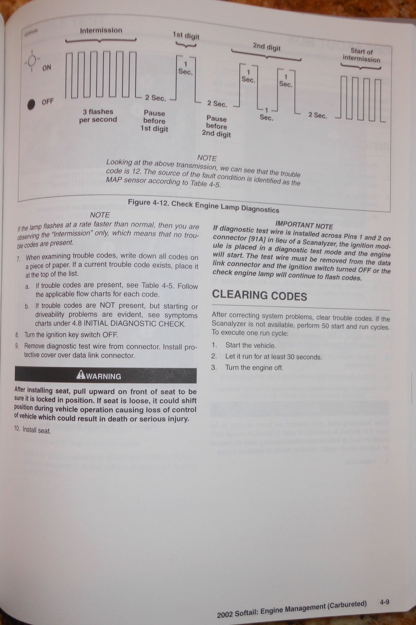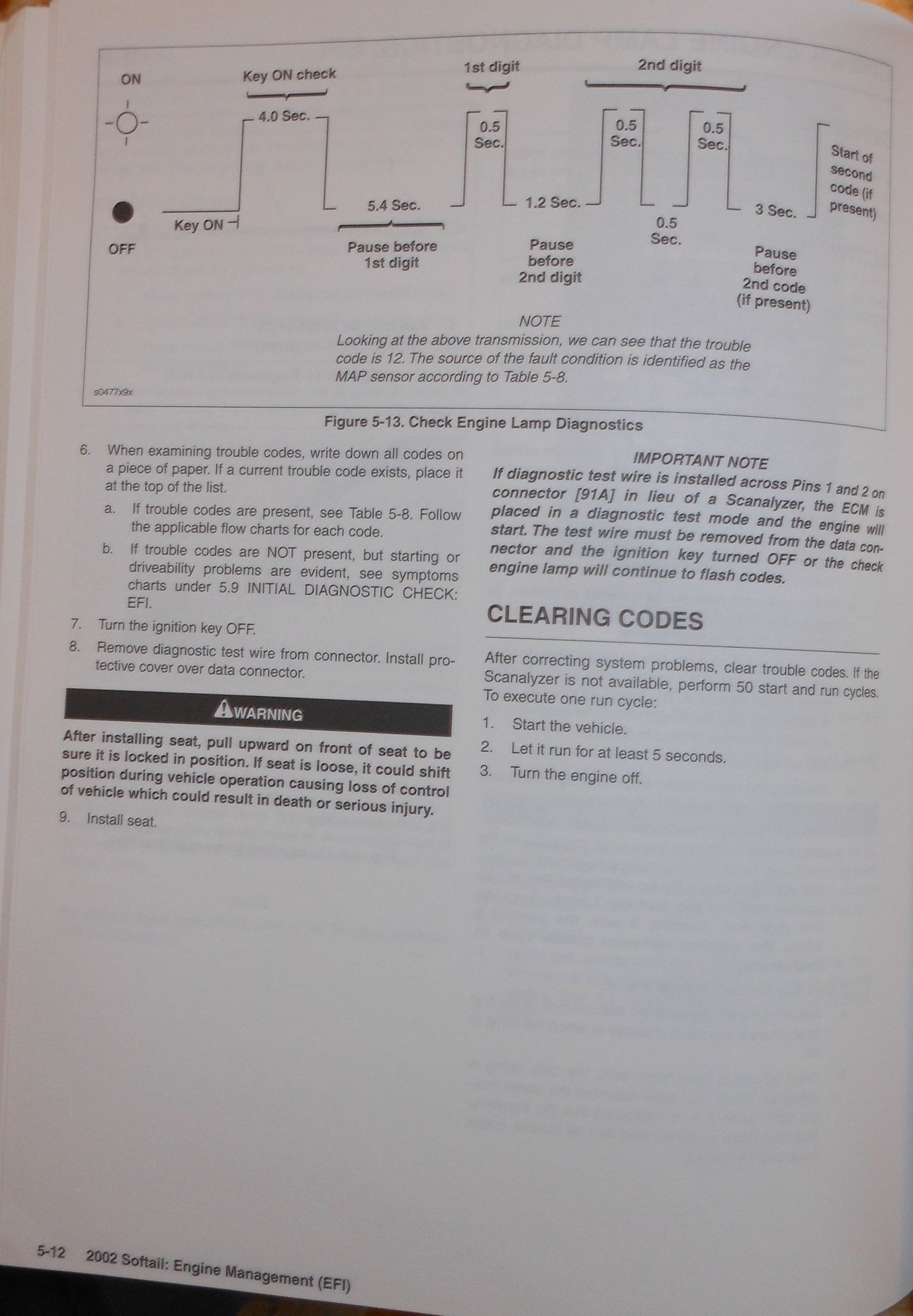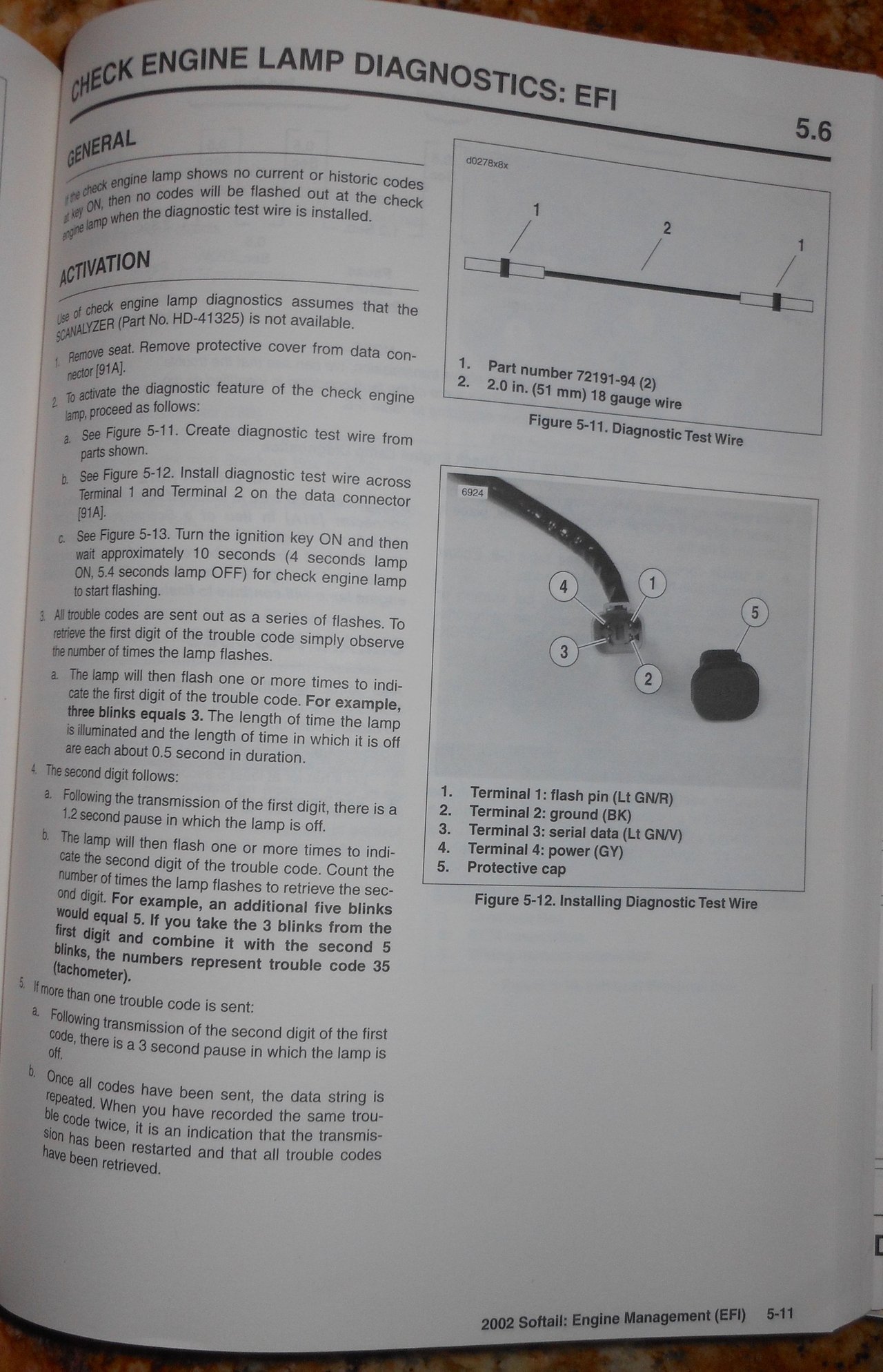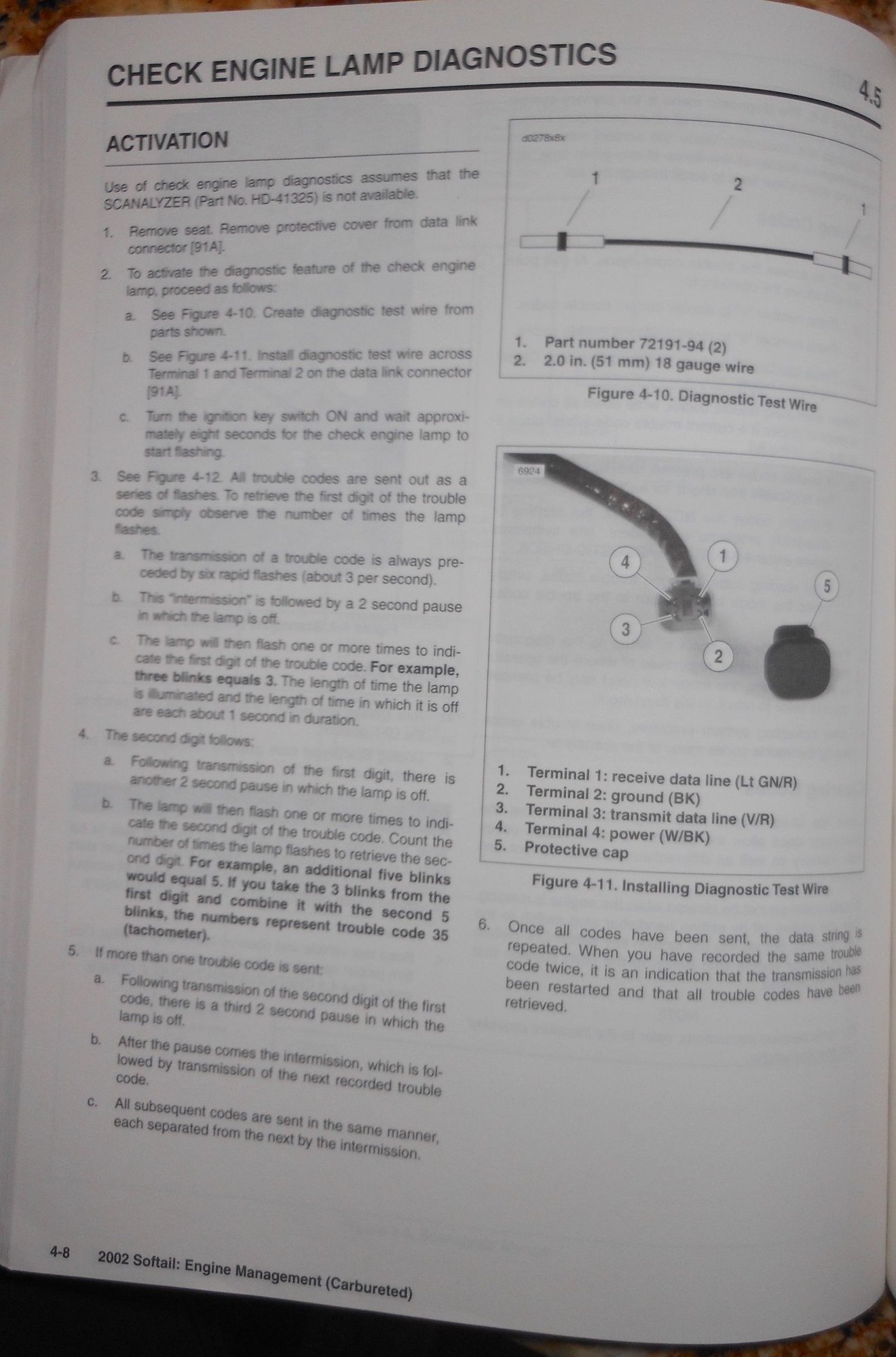 In the early Twin Cams, for Engine Diagnostic Codes, you need to use the jumper wire technique and count the flashes, or use the Harley Scanalyzer (a dealer tool), or the Digital Technician for EFI (dealer tool).